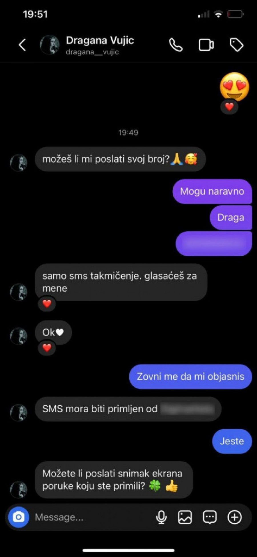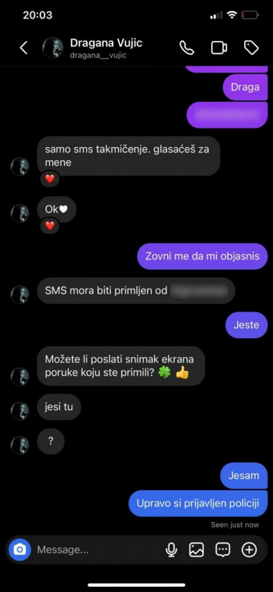 Nekoliko njenih prijatelja dobilo je poruke istog sadržaja. Sve što je bilo potrebno je da glasaju za Draganu u izmišljenom SMS takmičenju, a nakon glasanja, stigla im je poruka da su uspešno obavili kupovinu u iznosu od 2079 dinara za vaučer za igrice. Kada su shvatili o čemu je reč, alarmirali su glumicu, koja je odlučila da slučaj prijavi policiji.