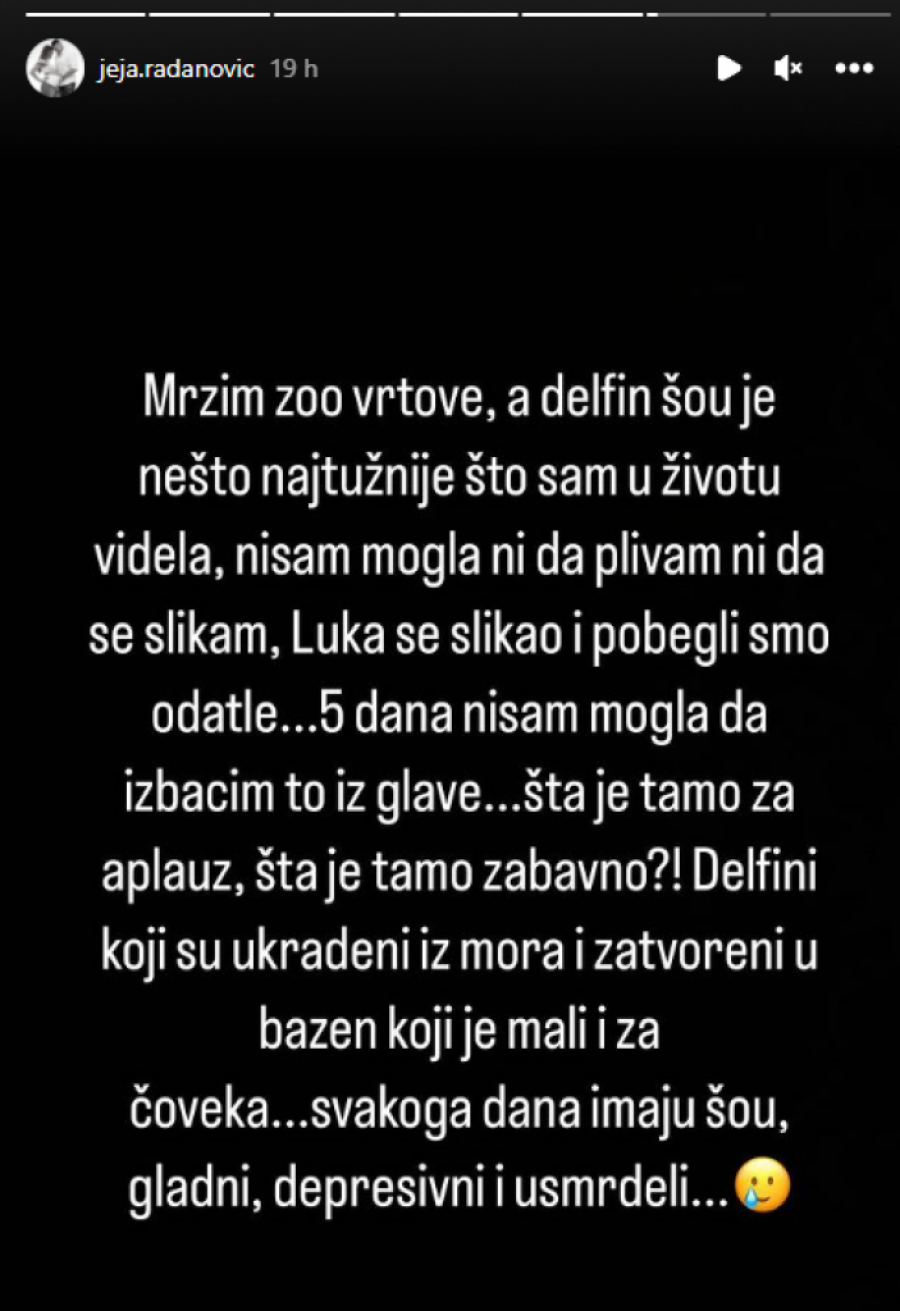 - Mrzim ZOO vrtove, a delfin šou je nešto najtužnije što sam u životu videla,nisam mogla ni da plivam, ni da se slikam, Luka se slikao i pobedli smo odatle... 5 dana nisam mogla da izbacim to iz glave. Šta je tamo za aplauz? Šta je tamo zabavno? Delfini koji su ukradeni iz mora i zatvoreni u bazen koji je mali i za čovek... Svakoga dana imaju šou, gladni, depresivni i usmrdeli - napisala je Jelena na Instagramu.