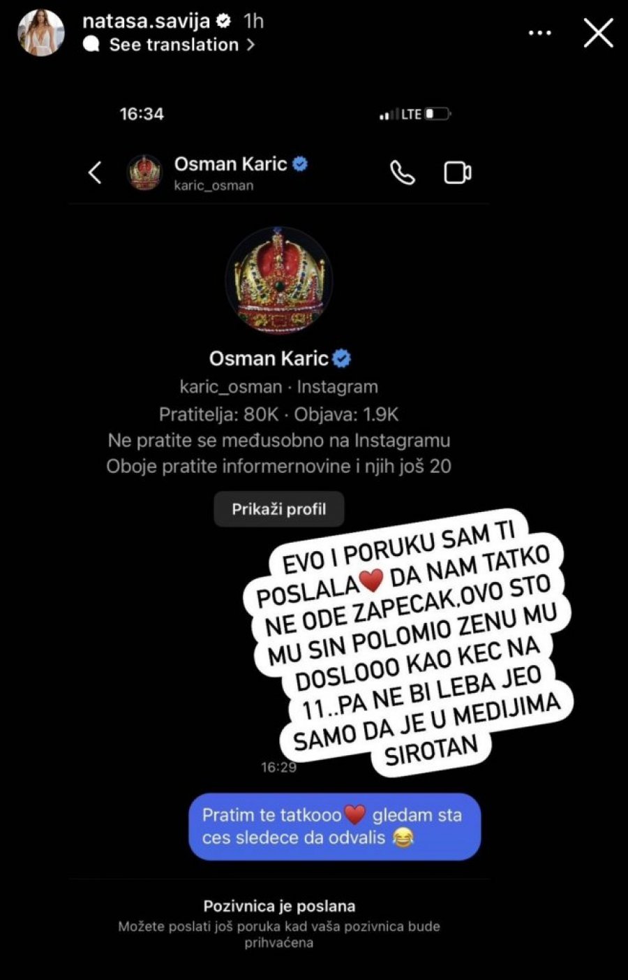Starleta Nataša Šavija već mesecima vodi rat sa porodicom Karić, nakon što ju je Stefan krvnički udario, čemu svedoče i njene tužbe koje je podnela protiv njega. U sve se umešao i Osman Karić, a sada je na Instagramu Šavija objavila prepisku sa njim, u kojoj mu je uputila ozbiljnu poruku.