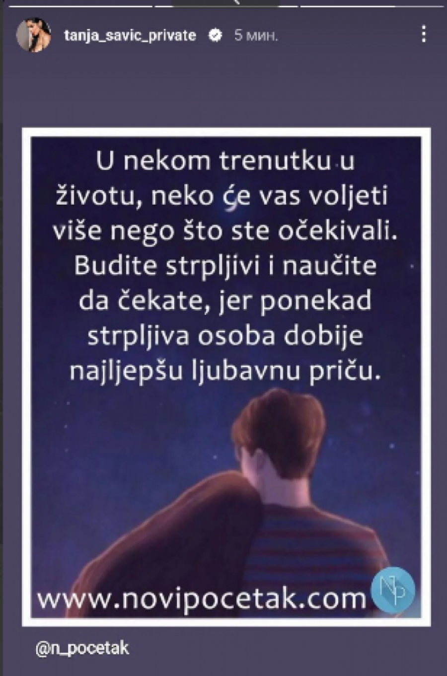 - U nekom trenutku u životu, neko će vas voleti više nego što ste očekivali. Budite strpljivi i naučite da čekate, jer ponekad strpljiva osoba dobije najlepšu ljubavnu priču - bio je status koji je Tanja podelila na Instagramu.