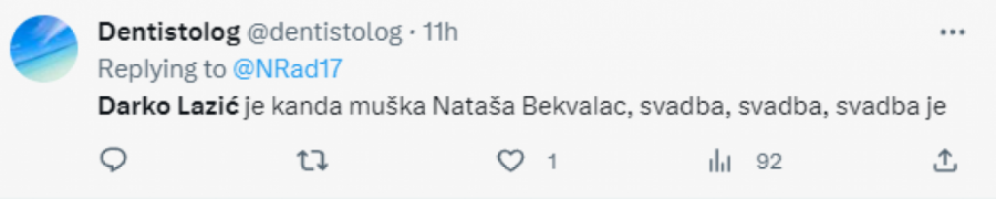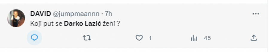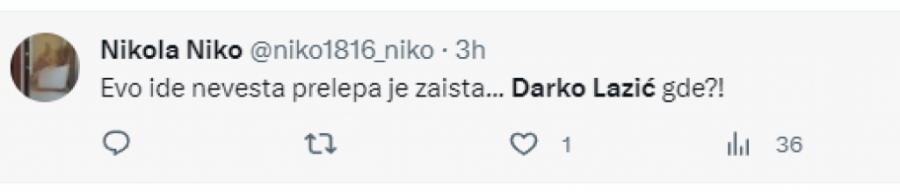Korisnici Tvitera su bili posebno maštoviti, pa je tako nastao niz šala na Darkov račun. "Koji put se Darko Lazić ženi?", "Darko Lazić je kanda muška Nataša Bekvalac, svadba, svadba, svadba", "Mrtva trka da li Darko Lazić ima više brakova ili saobraćajnih prestupa", "Evo ide nevesta, prelepa je zaista... Darko Lazić: Gde?!", "Darko Lazić neće stati dok sve žene ne oženi", "Hvala Bogu pa mi Darko Lazić nije rođak, radio bih samo njegove svadbe", "Ne budi škrtica, ženi se kao Darko Lazić", "Ako nikoga ne pronađem za brak, znam da je Darko Lazić uvek tu", samo su neki od komentara na ovoj društvenoj mreži.