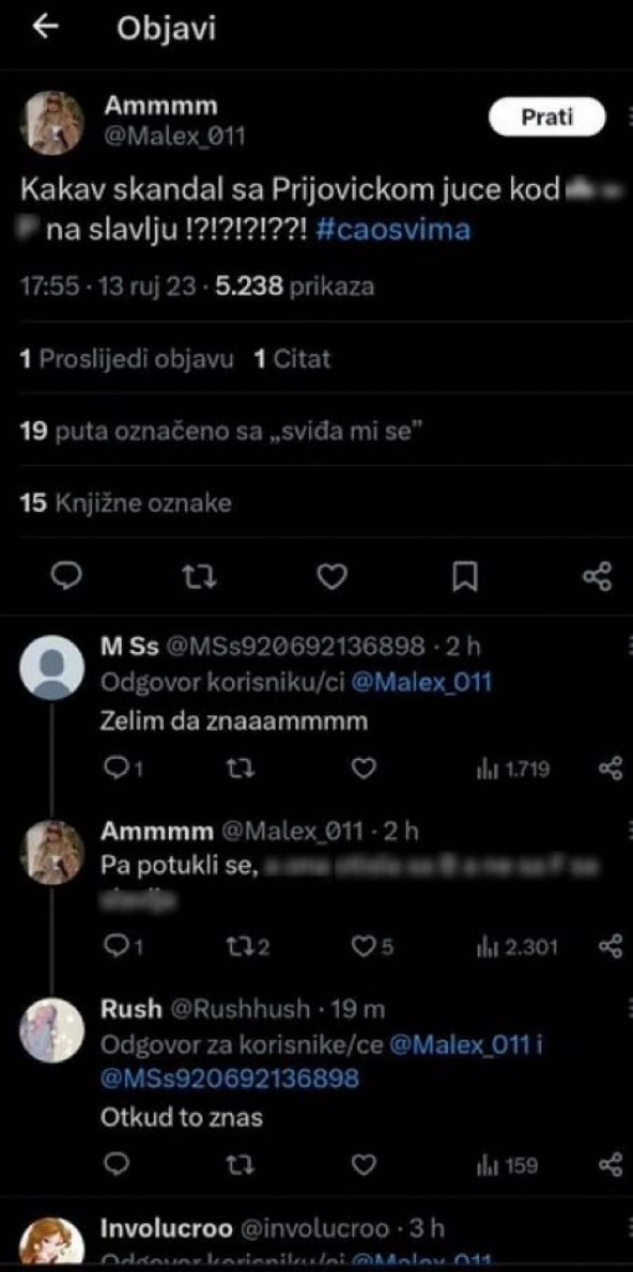 - Kakav skandal sa Prijovićkom juče na slavlju!?!?!?!??! Potukli se, tuča - muž i menadžer - navela je ova korisnica.