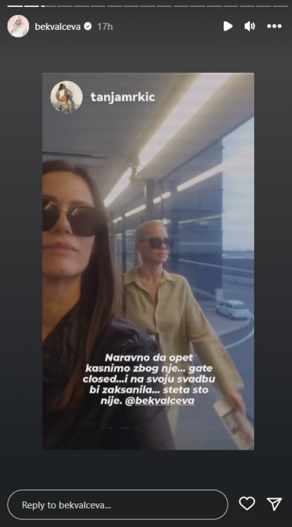 - Naravno da opet kasnimo zbog nje. Gejt je zatvoren... I na svoju svadbu bi zakasnila, šteta što nije - napisala je Tanja.