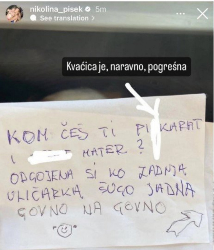 Naime, starijoj gospođi je zasmetalo kako se Pišekova parkirala, pa je kasnije najstrašnije izvređala u cedulji koju joj je zalepila na automobil.