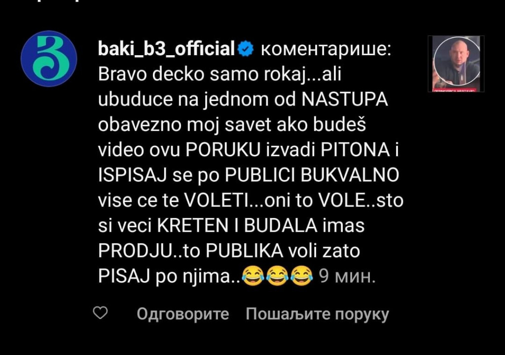 - Bravo dečko, samo rokaj, ali ubuduće na jednom od nastupa obavezno, moj savet ako budeš video ovu poruku, izvadi pitona i isp*šaj se po publici bukvalno više će te voleti. Oni to vole. Što si veći kreten i budala imaš prođu. to publika voli zato p*šaj po njima - napisal je pevač Baki B3 u komentaru ispod reperove objave na društvenoj mreži Instagram.