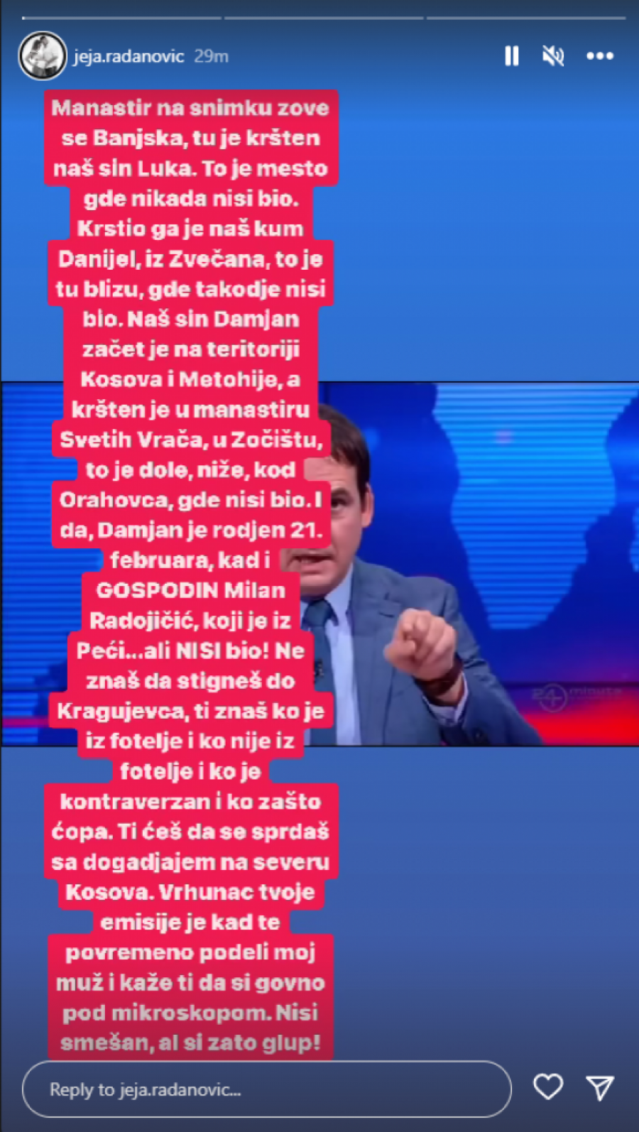 - Manastir na snimku zove se Banjska, tu je kršten naš sin Luka. To je mesto gde nikada nisi bio. Krstio ga je naš kum, Danijel, iz Zvečana, to je tu blizu, gde takođe nisi bio. Naš sin Damjan začet je na teritoriji Kosova i Metohije, a kršten je u manastiru Svetih Vrača, u Zočištu, to je dole, niže, kod Orahovca, gde nisi bio. I da, Damjan je rođen 21. februara, jad i gospodin Milan Radojičić, koji je iz Peći, ali nisi bio. Ne znaš da stigneš do Kragujevca, ti znaš ko je iz fotelje i ko je kontroverzan i ko zašto ćopa. Ti ćeš da se sprdaš sa događajem na severu Kosova. Vrhunac tvoje emisije je kad te povremeno podeli moj muć i kaže ti da si g*vno pod mikroskopom. Nisi smešan, ali si zato glup - napisala je Jelena Radanović, na svom profilu na društvenoj mreži Instagram, a onda dodala:
