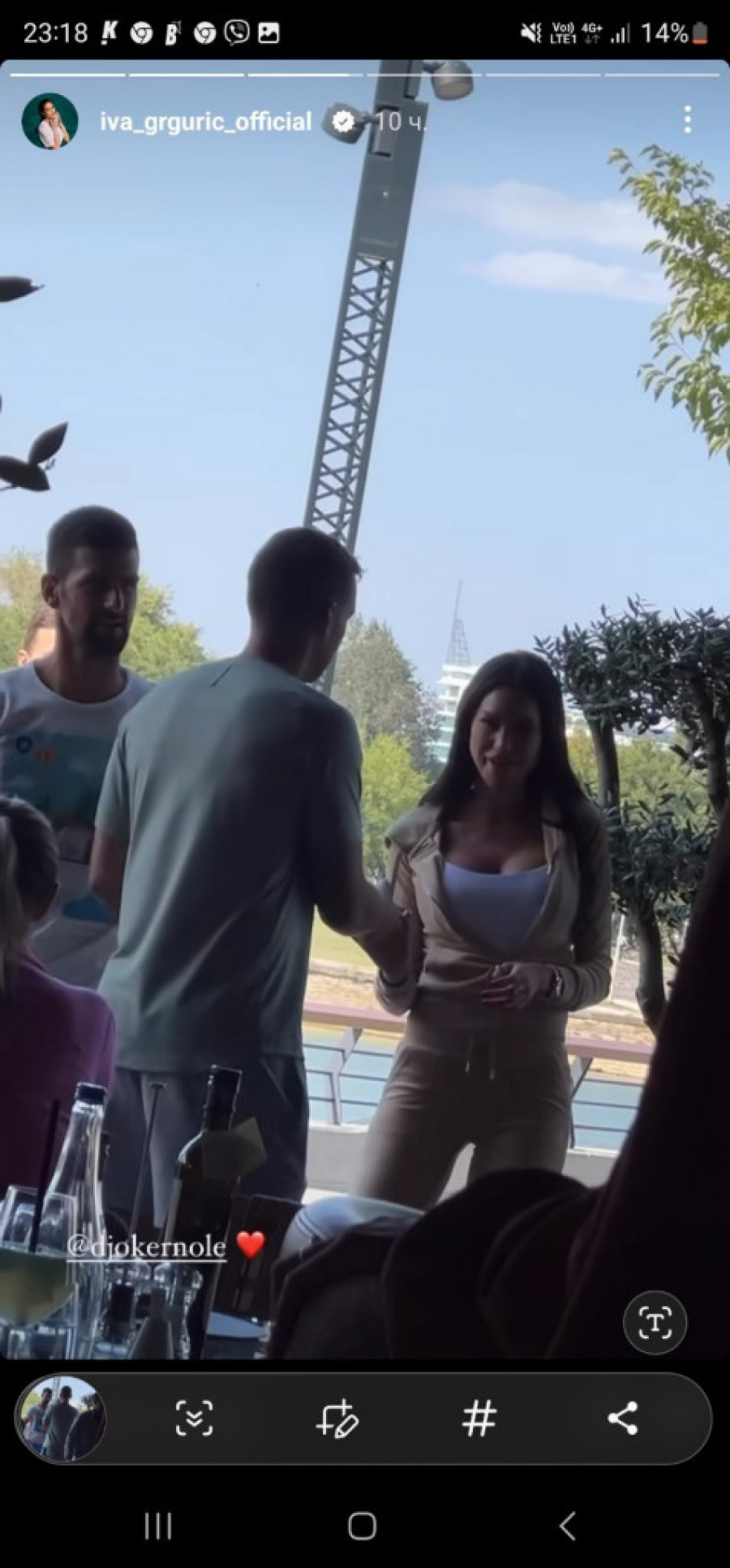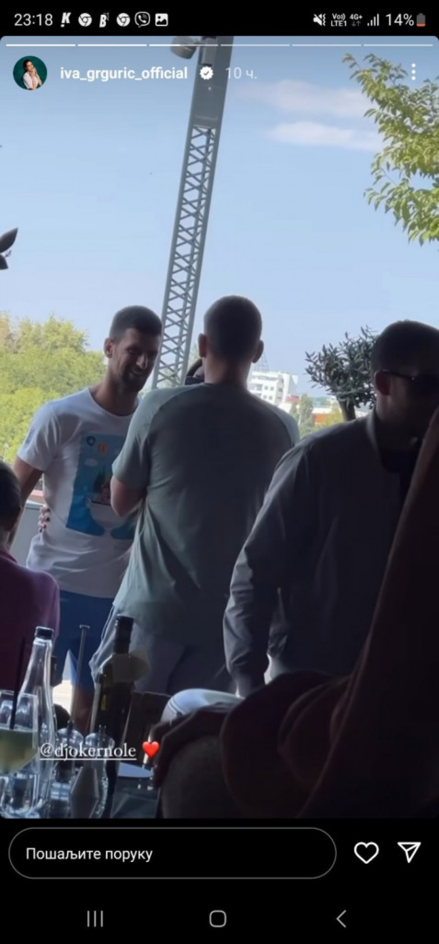 Susret Grgurićeva i Novaka se dogodio u jednom restoranu, gde je Iva uspela da uhvati trenutak za Instagram stori. Na fotografiji se vidi kako Iva stoji pored Novaka.