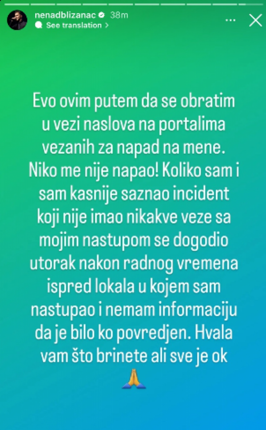 - Evo ovim putem da se obratim u vezi naslova na portalima vezanih za napad na mene. Niko me nije napao! Koliko sam i sam kasnije saznao incident koji nije imao nikakve veze sa mojim nastupom se dogodio utorak nakon radnog vremena ispred lokala u kojem sam nastupao i nemam informaciju da je bilo ko povređen. Hvala vam što brinete, ali sve je okej - napisao je Nenad.
