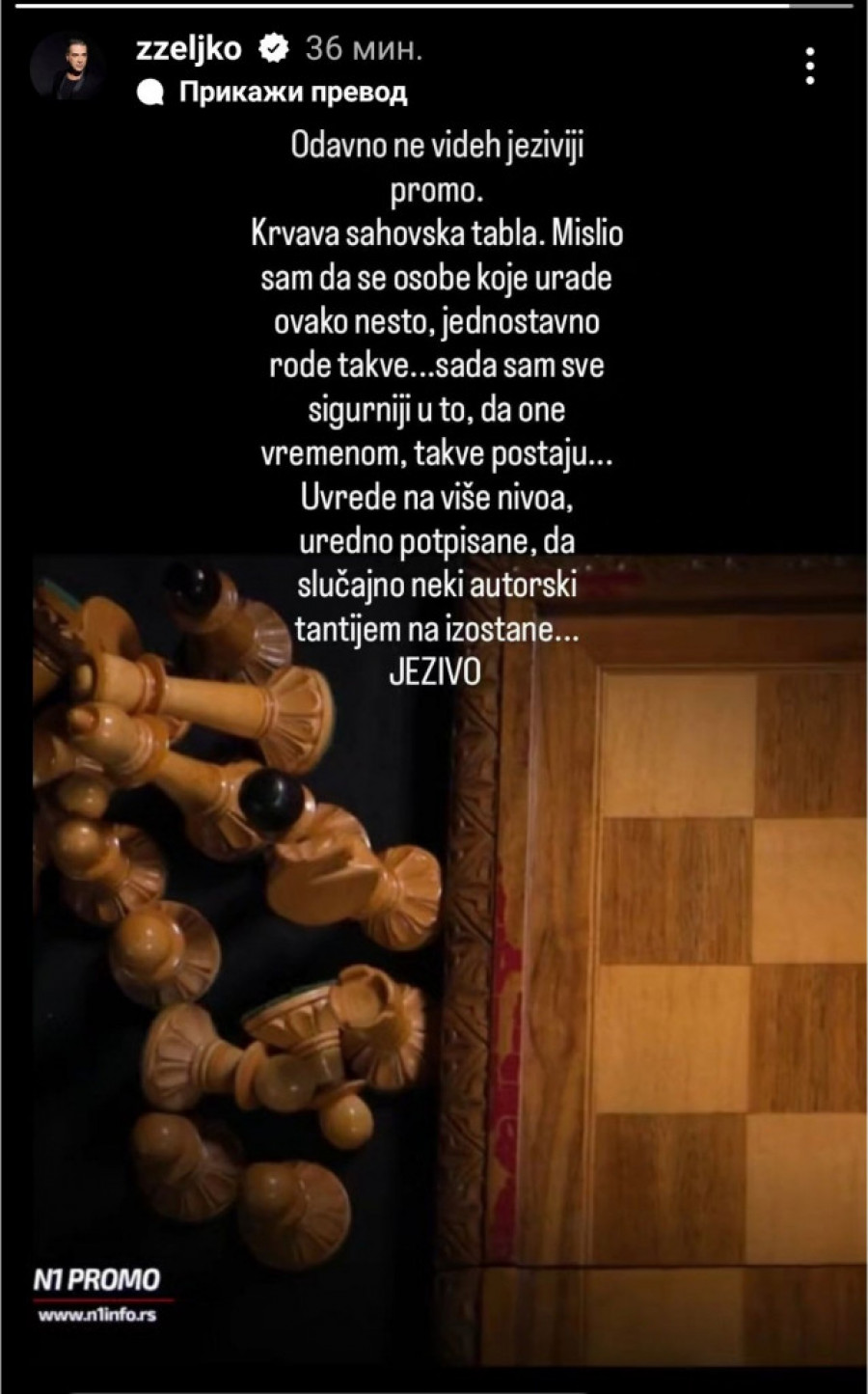 - Odavno ne videh jeziviji promo. Krvava šahovska tabla. Mislio sam da se osobe koje urade ovako nešto, jednostavno rode takve... Sada sam sve sigurniji u to, da one vremenom, takve postaju... Uvrede na više nivoa, uredno potpisane, da slučajno neki autorski tantijem ne izostane... JEZIVO - napsiao je Joksimović u svojoj objavi u Instagram priči.
