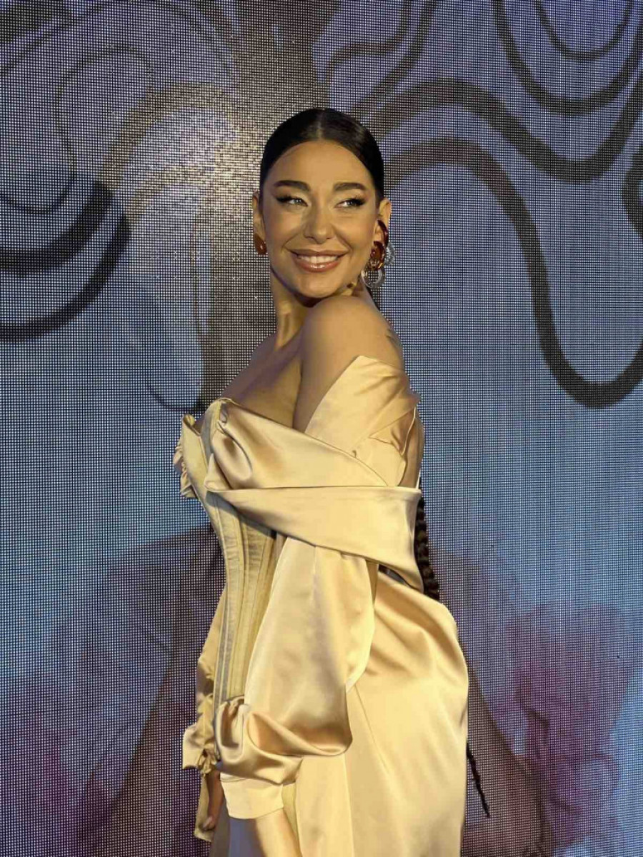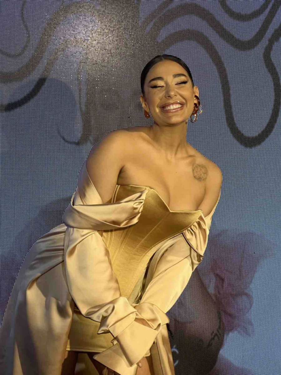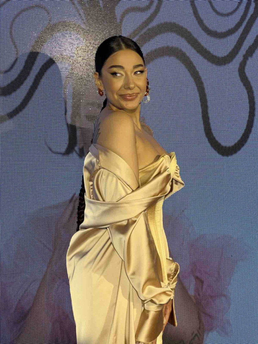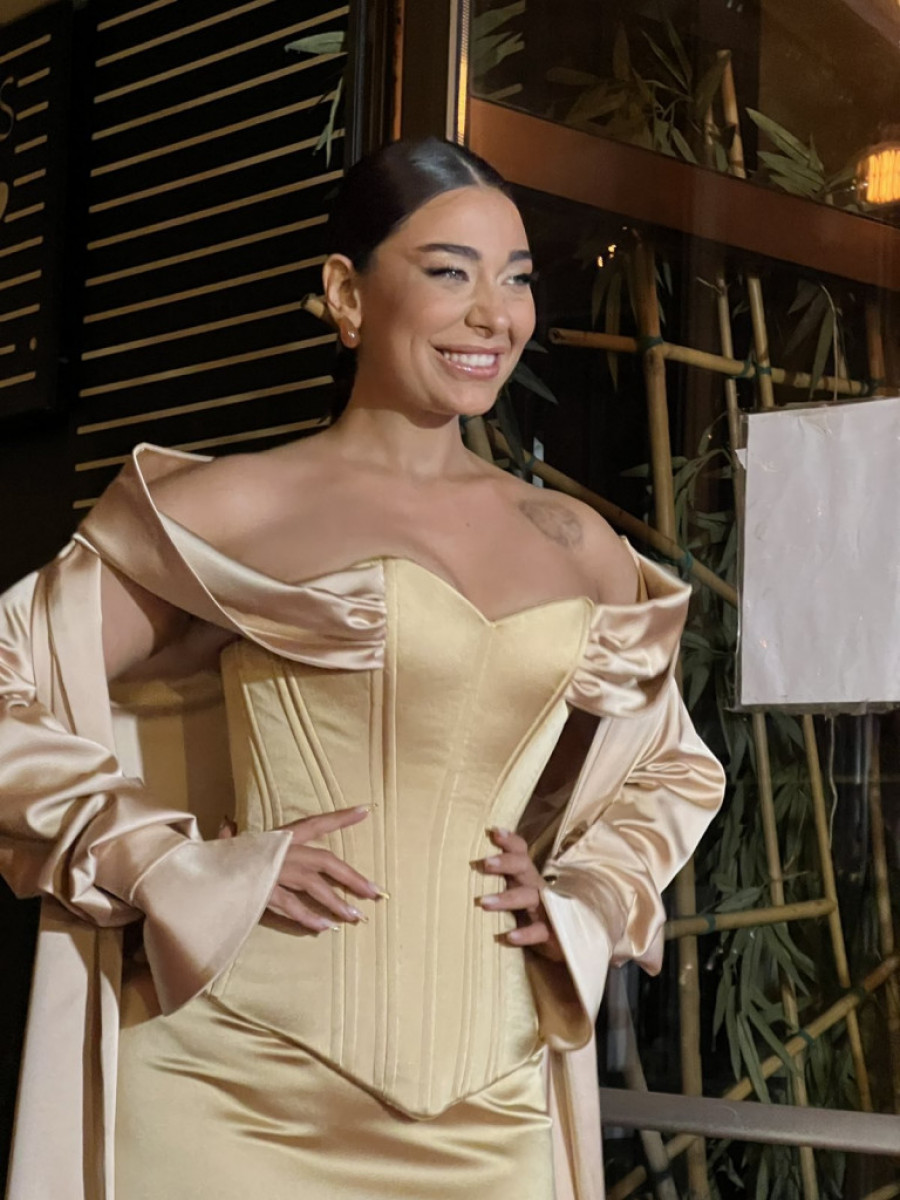 Njena haljina odisala je elegancijom, bila napravljena od materijala koji podseća na svilu, a gornji deo je imao oblik korseta koji je isticao njen zanosni dekolte. Donji deo haljine je bio mini, otkrivajući njene vitke noge i tetovaže koje do sada nismo imali priliku da vidimo.