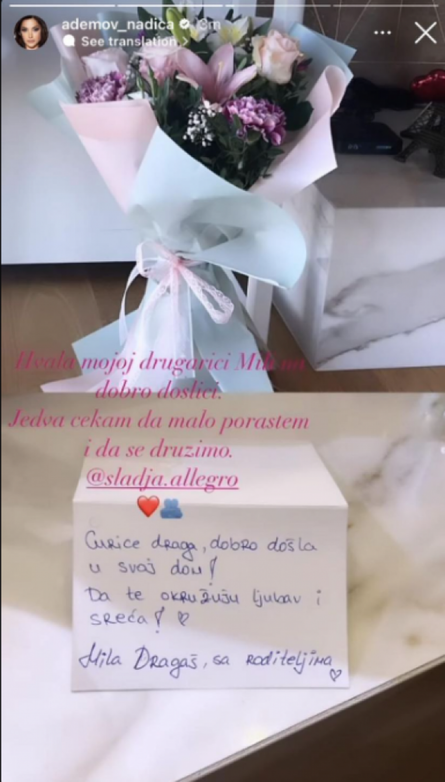 - Curice draga, dobro došla u svoj dom! Da te okružuju ljubav i sreća. Mila Dragaš sa roditeljima - pisalalo je u čestitki koja je posebnog značajna, jer je Mila ćerka poznate pevačice Slađe Alegro, a Nadica je srdačno zahvalila na ovom gestu.