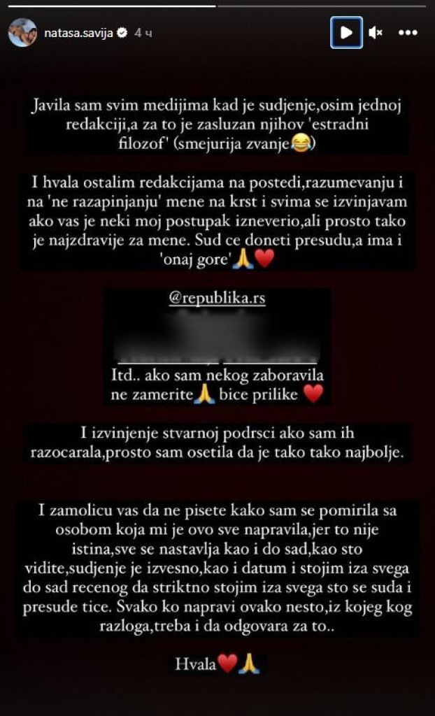 - I zamoliću vas da ne pišete kako sam se pomirila sa osobom koja mi je ovo sve napravila, jer to nije istina, sve se nastavlja kao i do sad, kao što vidite suđenje je izvesno, kao i datum i stojim iza svega do sad rečenog da strikto stojim iza svega što se suda i presude tiče. Svako ko napravi ovako nešto, iz kojeg god razloha treba i da odgovara za to - glasila je njena objava.