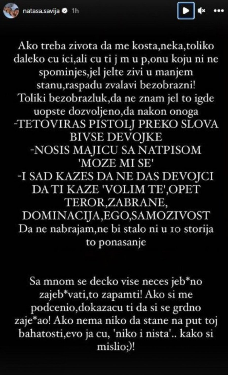 - Ako treba života da me košta, neka, toliko daleko ću ići, ali ću ti j* m* u p*, onu koju ni ne spominješ, jer jelte živi u manjem stanu, raspadu žvalavi bezobrazni! Toliki bezobrazluk, da ne znam je l' to igde uopšte dozvoljeno, da nakon onoga tetoviraš pištolj preko slova bivše devojke, nosiš majicu sa natpisom "može mi se" i sad kažeš da ne daš devojci da ti kaže "volim te", opet teror, zabrane, dominacija, ego, da ne nabrajam. Sa mnom se dečko više nećeš je*no za*ebavati, to zapamti! Ako si me potcenio, dokazaću ti da si se grdno zaje*ao! Ako nema niko da stane na put toj bahatosti, evo ja ću, "niko i ništa"... Kako si mislio - poručila je ona u objavi na Instagramu, ali se tu nije zaustavila već je nastavila:
