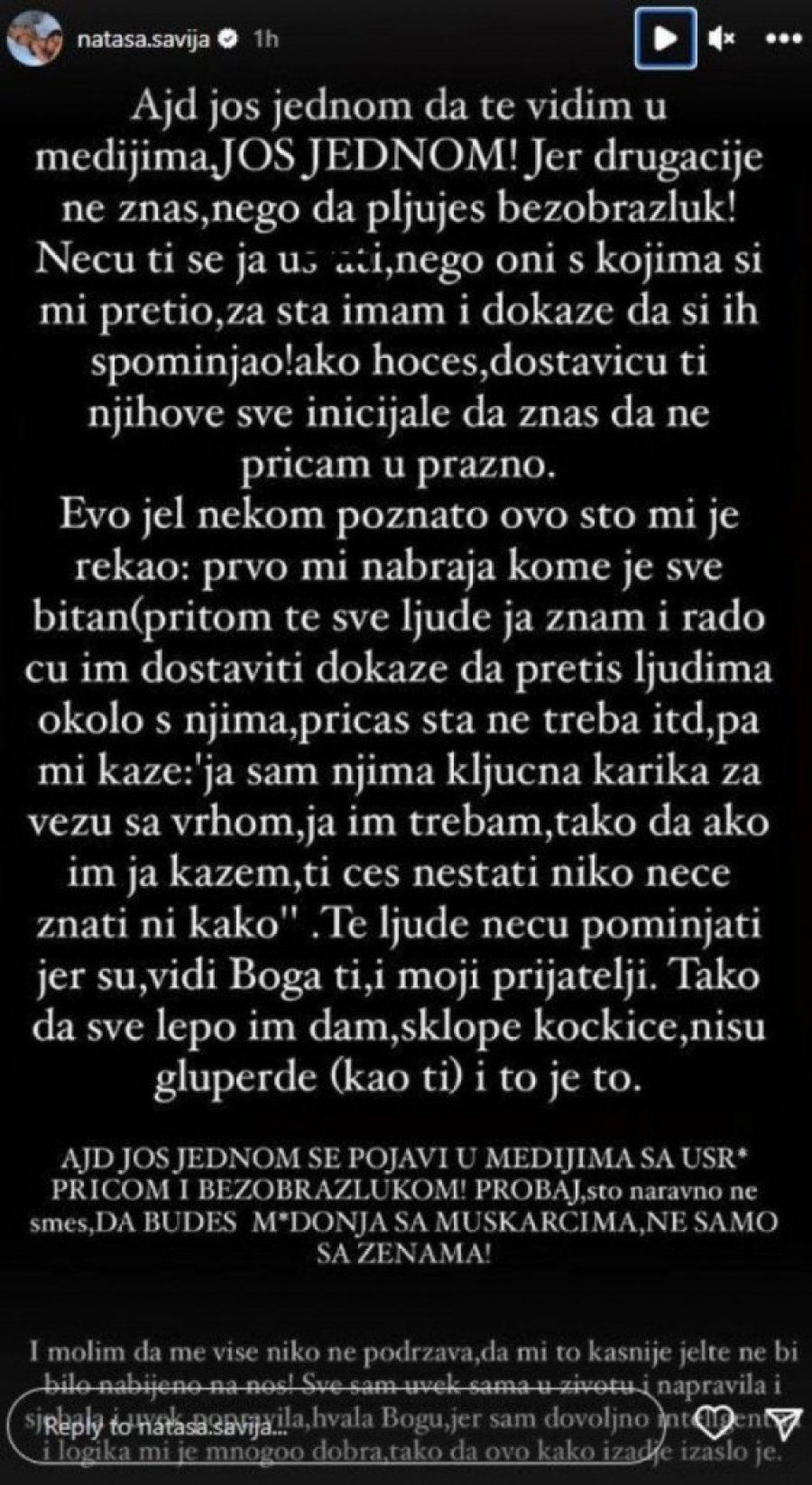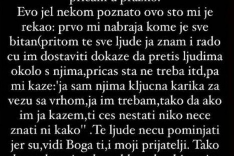 - Hajde još jednom da te vidim u medijima, još jednom! Jer drugačije ne znaš, nego da pljuješ, bezobrazluk! Neću ti se ja u*rati, nego oni s kojima si mi pretio, za šta imam i dokaze da si ih spominjao! Ako hoćeš, dostaviću ti njihove sve inicijale da znaš da ne pričam u prazno. Evo, da li je nekom poznato ovo što mi je rekao: prvo mi nabraja kome je sve bitan; pritom te sve ljude ja znam i rado ću im dostaviti dokaze da pretiš ljudima okolo s njima, pričaš šta ne treba... Pa mi kaže: "Ja sam njima ključna karika za vezu sa vrhom, ja im trebam, tako da ako im ja kažem, ti ćeš nestati niko neće znati ni kako". Te ljude neću pominjati jer su vidi Boga ti i moji prijatelji. Tako da sve lepo im dam, sklope kockice, nisu gluperde (kao ti) i to je to. I molim da me više niko ne podržava, da mi to kasnije jelte ne bi bilo nabijeno na nos! Sve sam uvek sama u životu i napravila i sj*bala i uvek popravila, hvala Bogu, jer sam dovoljno inteligentna i logika mi je mnogo dobra, tako da ovo kako izađe izašlo je.