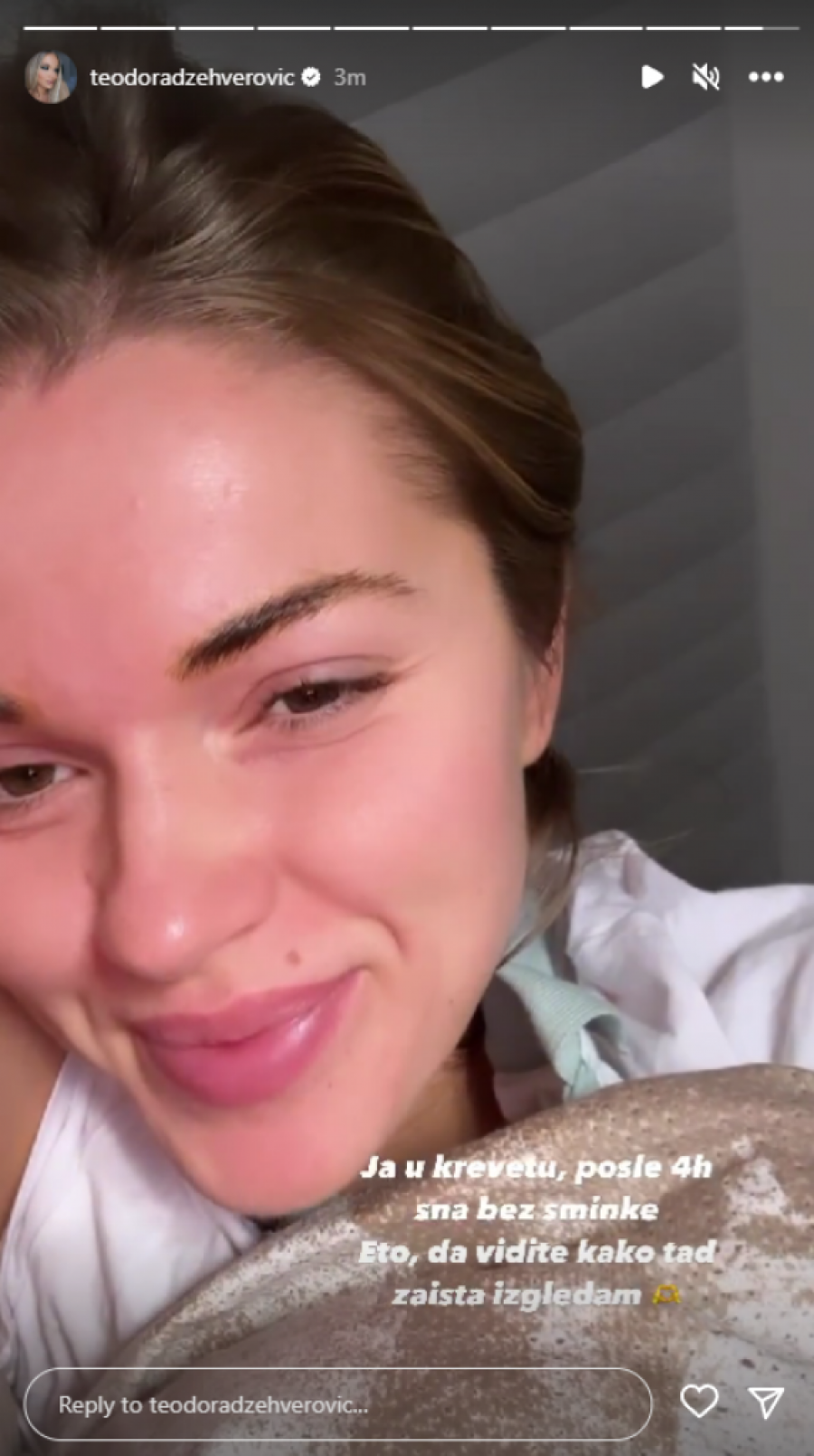 Ona je odlučila da svojim pratiocima pokaže kako izgleda kad se tek probudi, bez trunke šminke i sa jako malo sati sna. Teodora je pozirala u krevetu i na svoj profil okačila snimak.