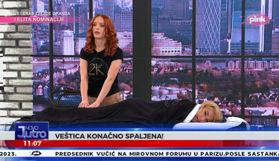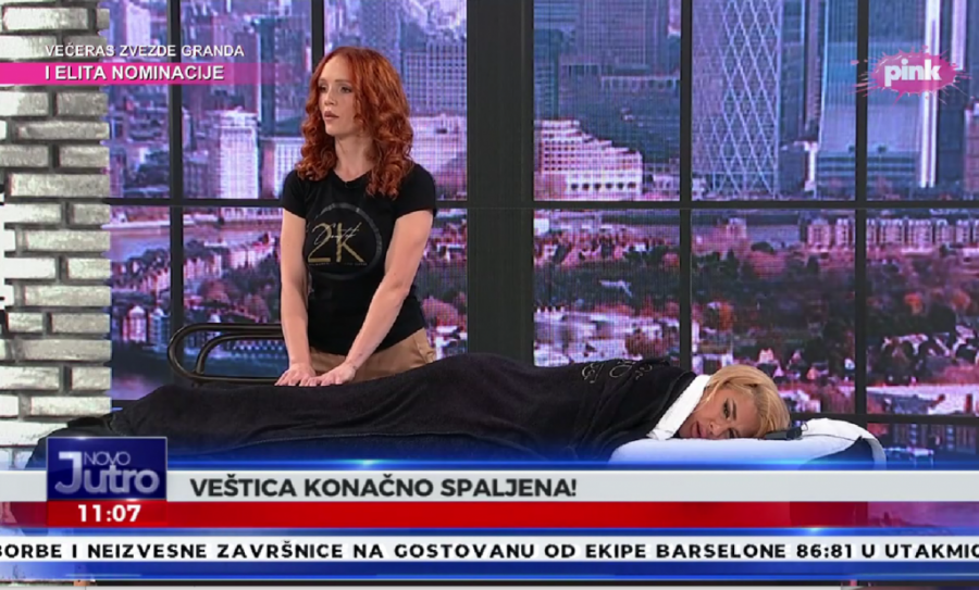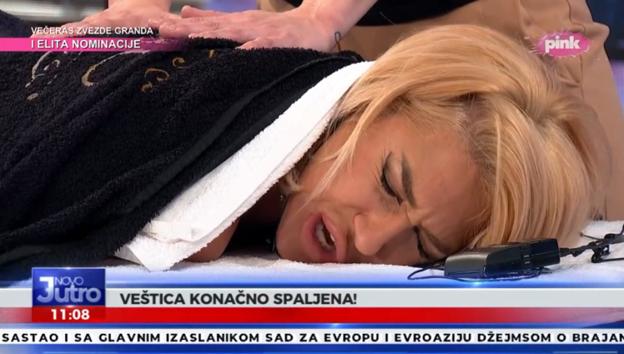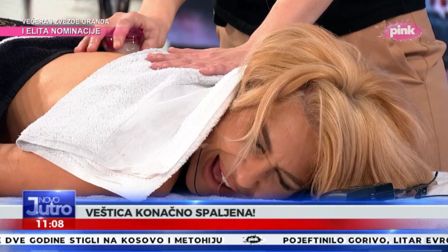 Popularna voditeljka Jovana Jeremić, koja je dobila unapređenje na televiziji Pink, danas se u emisiji "Novom vikend jutru" podvrgla zanimljivom tretmanu. Jovana je pristala na interesantnu masažu, koja je obavljena uživo u programu. Jovana je u jednom trenutku "živa spaljena", pa je segment nazvala "Veštica je spaljena".