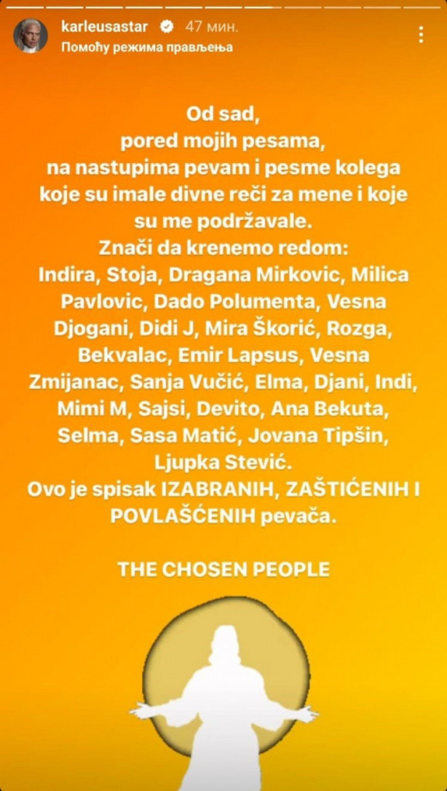 - Od sad, pored mojih pesama, na nastupima pevam i pesme kolega koje su imale divne reči za mene i koje su me podržavale. Znači, da krenemo redom: Indira, Stoja, Dragana Mirković, Milica Pavlović, Dado Polumenta, Vesna Đogani, Didi Džej, Mira Škorić, Jelena Rozga, Nataša Bekvalac, Emir Lapsus, Vesna Zmijanac, Sanja Vučić, Elma Sinanović, Đani, Indi, Mimi Mercedez, Sajsi MC, Devito, Ana Bekuta, Selma Bajrami, Saša Matić, Jovana Tipšin, Ljupka Stević. Ovo je spisak izabranih, zaštićenih i povlašćenih pevača. Izabrani ljudi - napisala je Karleuša, te dodala: