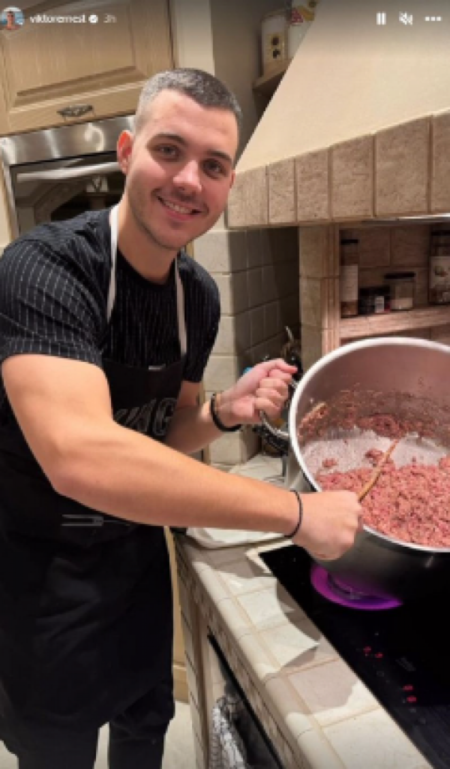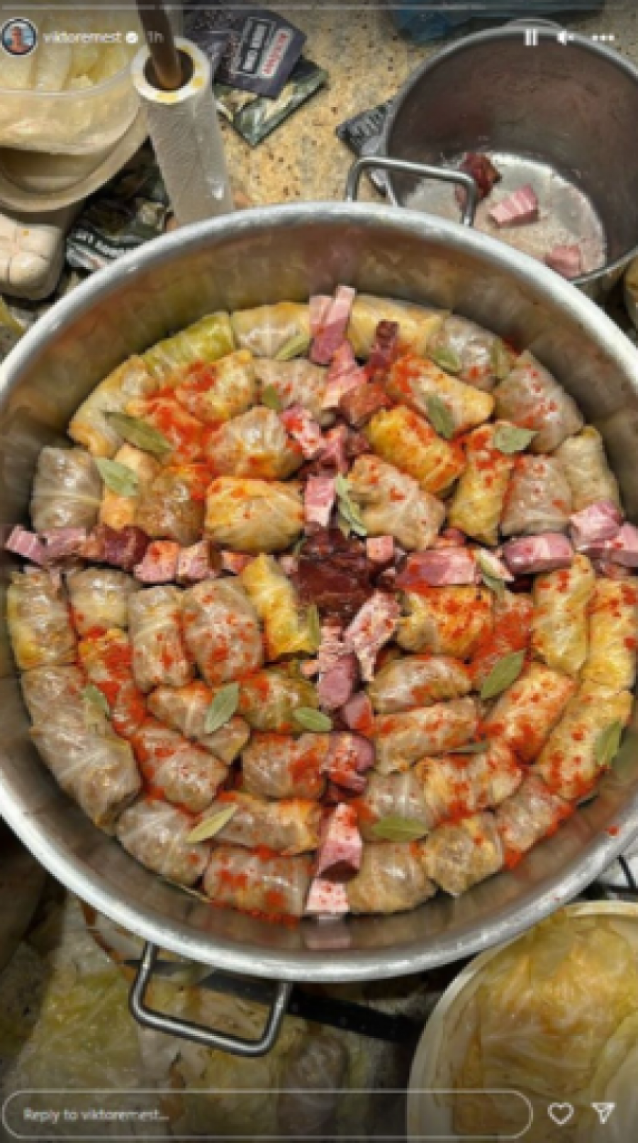Viktor se slikao najpre pored šerpe pune mlevenog mesa, da bi potom pokazao i žene koje su zavijale sarme. Na kraju je slikao i završni proces pred samo krčaknje. Sve to je začinio dobrom muzikom, pa se u pozadini čuo hit "Romanija" Halida Bešlića, uz koji je đuskao sve vreme.