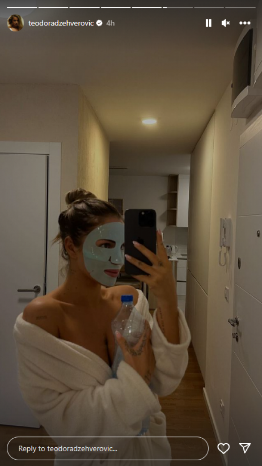 Naime, Teodora se slikala u ogledalu u kućnoj atmosferi. Ona je koristila slobodno vreme za ulepšavanje, pa je preko lica imala masku, a na telu samo bademantil. Džehverovićeva je ssvukla bademantil, pa su joj grudi došle do izražaja, kao i gola ramena.