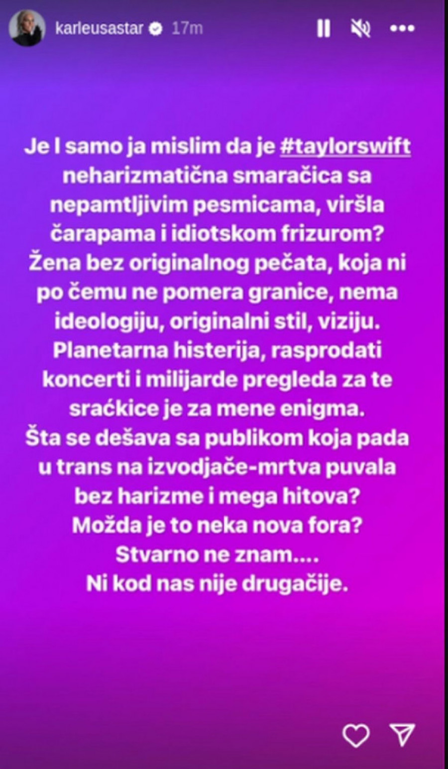 - Jel samo ja mislim da je Tejlor Svift neharizmatična smaračica sa nepamtljivim pesmicama, viršla čarapama i idiotskom frizurom? Žena bez originalnog pečata, koja ni po čemu ne pomera granice, nema ideologiju, originalni stil, viziju. Planetarna histerija, rasprodati koncerti i milijarde pregleda za te sraćkice je za mene enigma. Šta se dešava sa publikom koja pada u trans na izvođače - mrtva puvala bez harizme i mega hitova? Možda je to neka nova fora? Stvarno ne znam... Ni kod nas nije drugačije - poručila je Karleuša na Instagram profilu.