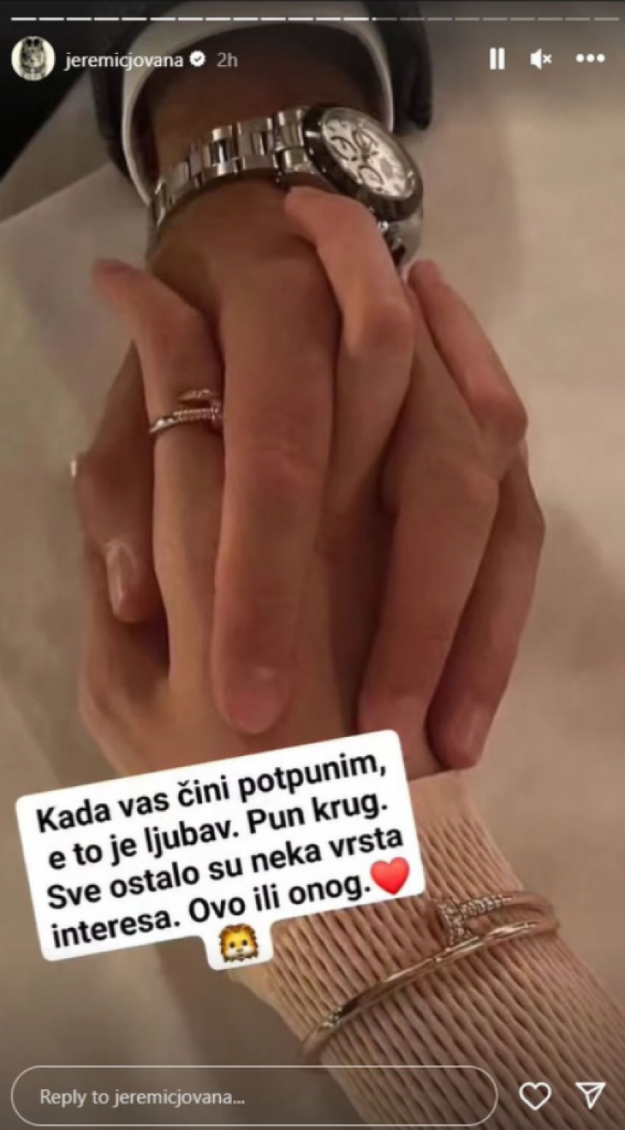 - Kad je Jovana rekla da je ponovo u vezi, prva sam joj čestitala. Verujem u ljubav i nekako mi intuicija govori da je to ona prava. Videćemo, sve će se brzo odvijati u jednom lepo smeru. Pevam im na svadbi, ovo će biti večna ljubav, osećam to! Želim Jovani sve što želim i sebi od srca! Samo se prava ljubav računa! Sve ostale su samo broj. Ona je princeza i zaslužuje svu sreću ovog sveta!