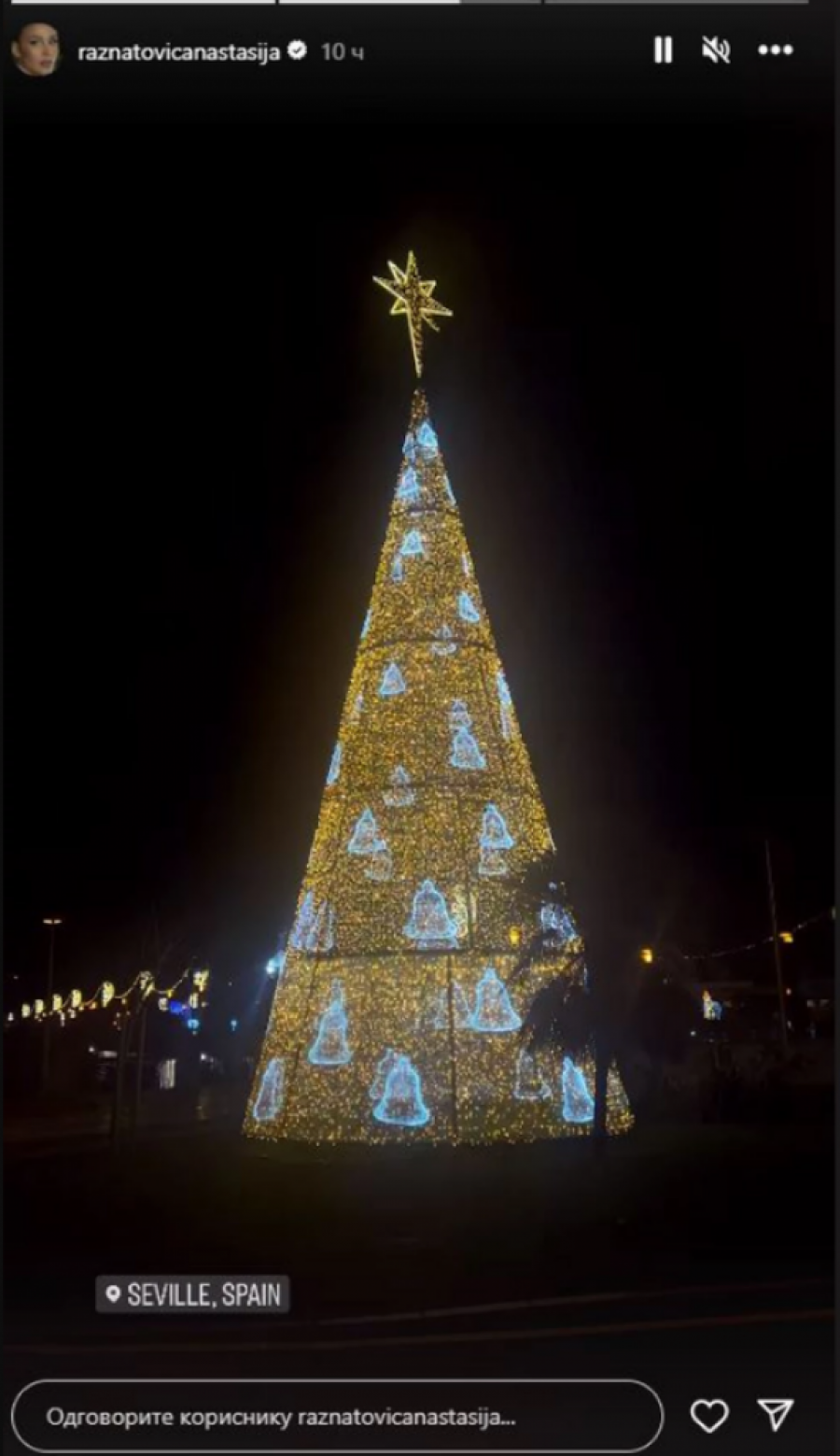 Anastasija Ražnatović, nakon udaje za fudbalera Nemanju Gudelju, preselila se u Sevilju gde trenutno uživa u prazničnoj atmosferi. Na svom Instagram profilu, Anastasija je podelila video snimak ogromne jelke koja krasi trg u centru grada. Jelka je ukrašena hiljadama lampica, sa detaljima u obliku zvončića, dok se na vrhu ističe velika zvezda. Ovaj bajkoviti prizor oduševio je mnoge, a Anastasija je ubrzo napravila i selfi, pozirajući bez šminke i u opuštenom izdanju, a nikome nije mogao da promakne skupoceni šal marke "Gucci" koji je imala na sebi.