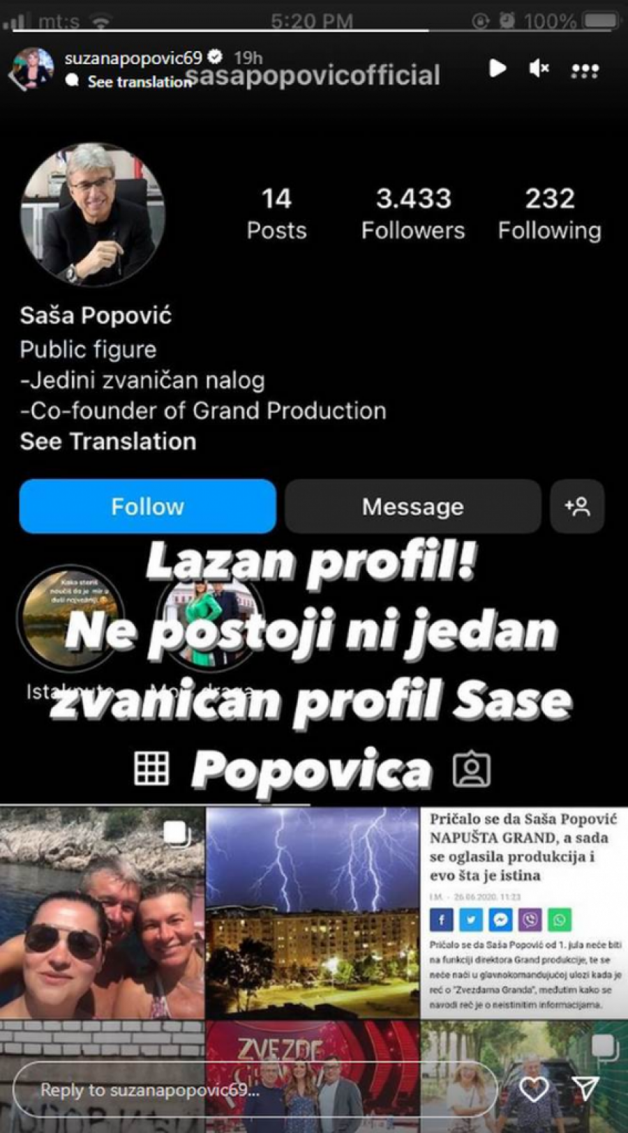 - Lažan profil! Ne postoji nijedan zvaničan profil Saše Popovića - napisala je Suzana Jovanović na Instagram profilu.