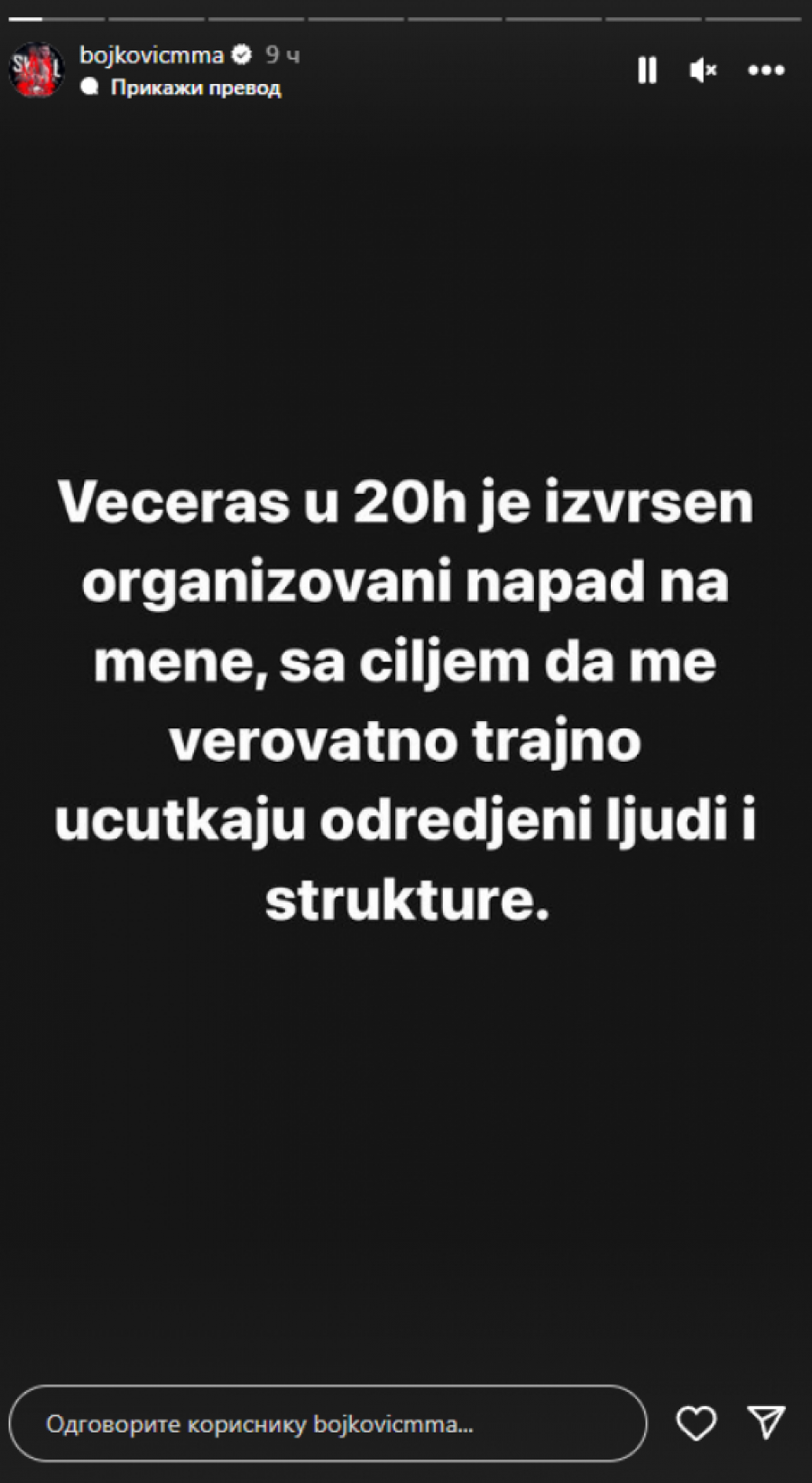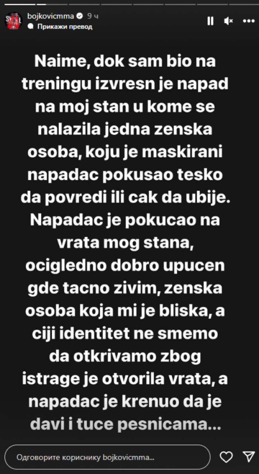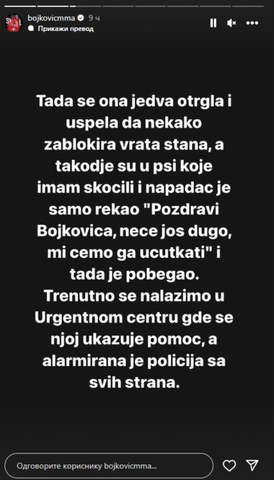 - Tada se ona jedva otrgla i uspela da nekako zablokira vrata stana, a takođe su i psi koje imam skočili i napadač je samo rekao: "Pozdravi Bojkovića, neće joj dugo, mi ćemo ga ućutkati" i tada je pobegao. Trenutno se nalazimo u Urgentnom centru, gde se njoj ukazuje pomoć, a alarmirana je policija sa svih strana - dodao je MMA borac.