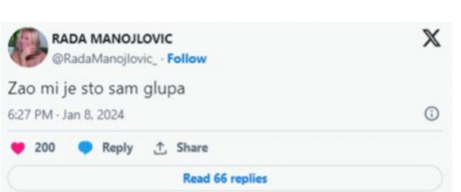 Popularna pevačica Rada Manojlović važi za aktivnu osobu na društvenoj mreži "X" bivši Tviter, na kojoj je često znala napraviti opštu pometnju svojim stavovima i teorijama zbog čega su je neretko i prozivali. Pevačica se tako na drugi dan Božića oglasila na pomenutoj mreži, a svojom objavom je iznenadila sve fanove.