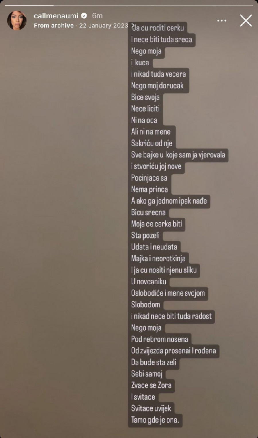 - Ja ću roditi ćerku i neće biti tuđa sreća, nego moja, i kuća, i nikad tuđa večera, nego moj doručak, biće svoja, neće ličiti ni na oca, ali ni na mene, sakriću od nje sve bajke u koje sam ja verovala i stvoriću joj nove, počinjaće sa - nema princa, a ako ga jednom ipak nađe, biću srećna, moja će ćerka biti šta poželi, udata i neudata, majka i nerotkinja, i ja ću nositi njenu sliku u novčaniku, oslobodiće i mene svojom slobodom, i nikad neće biti tuđa radost, nego moja, pod rebrom nošena, od zvezda prošena i rođena da bude šta želi, sebi samoj, zvaće se Zora i svitaće, svitaće uvek tamo gde je ona - ispisala je Mina u svojoj Instagram priči.