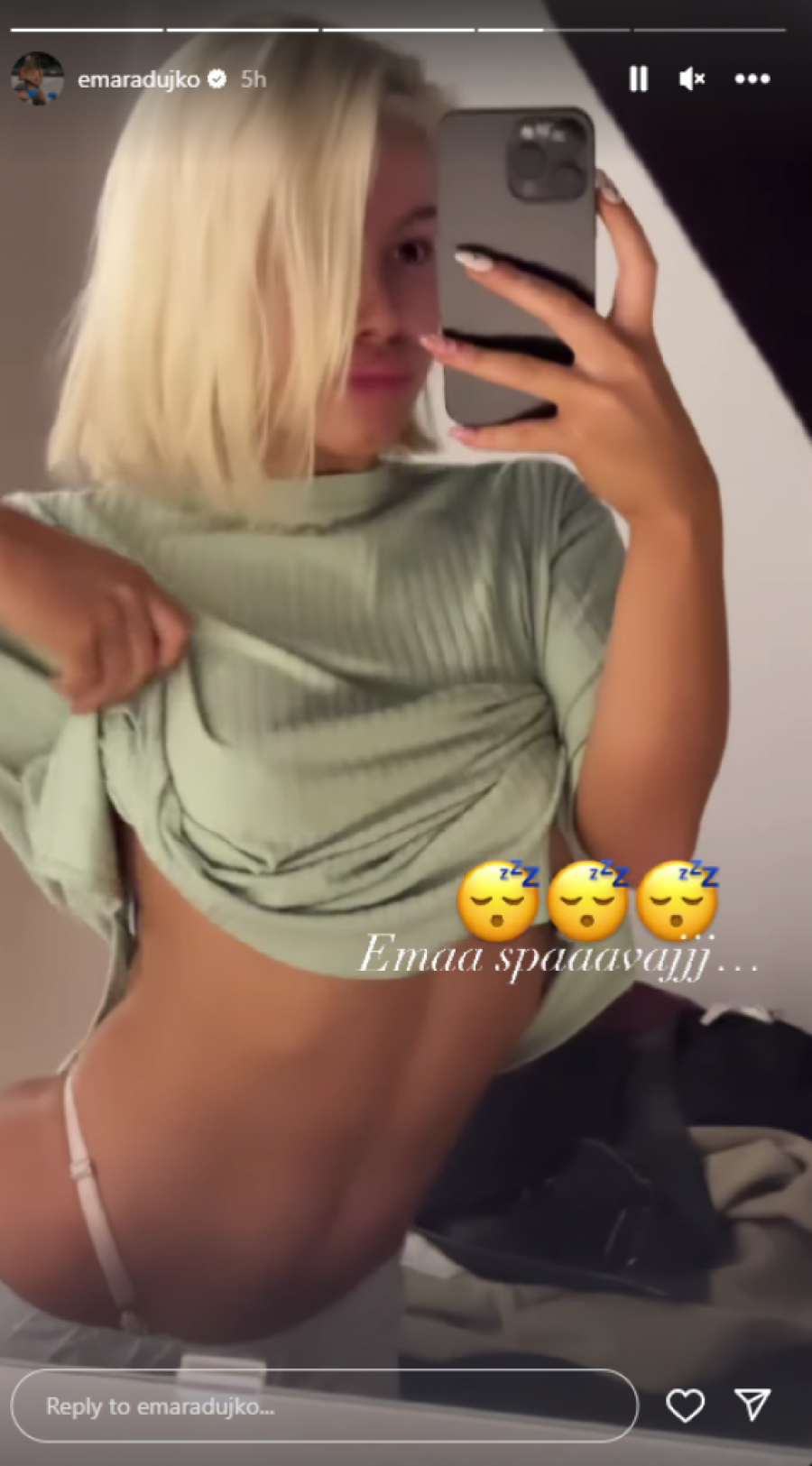Ema Radujko, mlada pevačica i influenserka, ponovo je privukla pažnju javnosti svojim provokativnim sadržajem na društvenim mrežama. Ovoga puta, ona je objavila snimak kako pozira u provokatinom izdanju. Naime, ona je spustila trenerku i pokazala tanga gaćice i tako se snimala u ogledalu. Iako je delimično bila obučena mogla je da joj se vidi oblikovana zadnjica, po kojoj je pevačica prepoznatljiva.