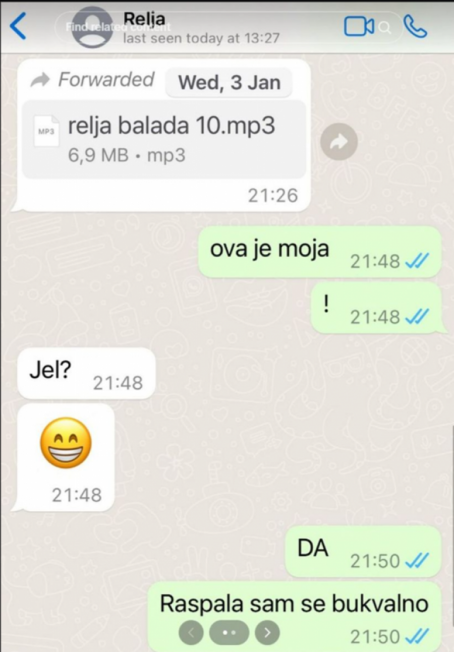 - Ova je moja - napoisala je Nikolija, a na to je Relja odgovorio emotikonom koji simbolizuje zadovoljstvo.