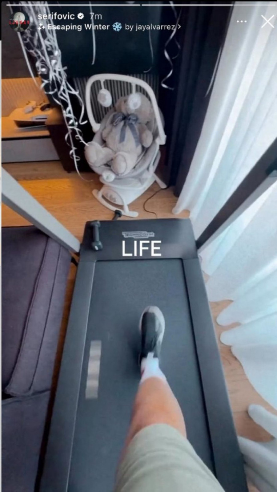 Naime, Šerifovićeva većinu vremena provodi u svom domu na Beogradu na vodi, gde je sada odlučila da se posveti treninzima i dovede svoju liniju do savršenstva. Snimak na kome trči na traci, sa bebom i plišanom igračkom malog Maria pokazuje njenu posvećenost novom načinu života.
