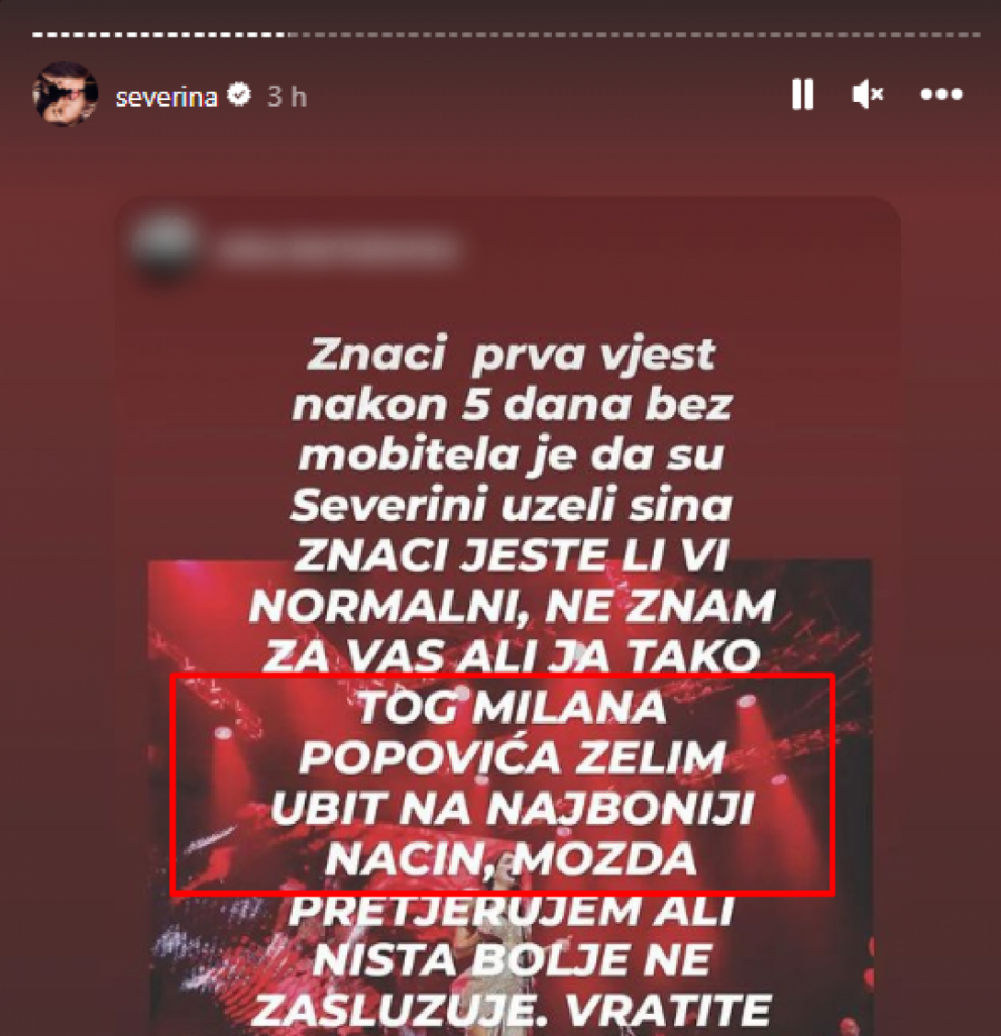 - Znači, prva vest nakon 5 dana bez telefona je da su Severini uzeli sina, znači, jeste li vi normalni, ne znam za vas, ali ja tako tog Milana Popovića želim ubiti na najbolniji način, možda preterujem, ali ništa bolje ne zaslužuje - glasi poruka koju je Severina objavila na Instagram profilu.