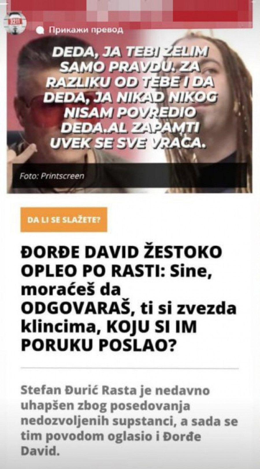 - Deda, ja tebi želim samo pravdu. Za razliku od tebe, ja nikoga nikada nisam povredio, deda. Ali zapamti, uvek se sve vraća - napisao je Rasta.