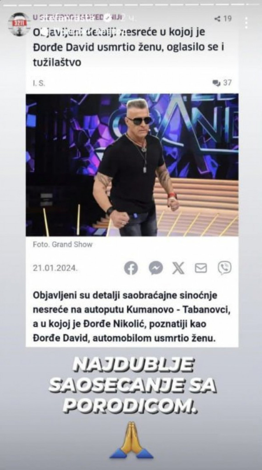 Nakon oštre kritike upućene Đorđu Davidu, Rasta je na svom Instagram profilu objavio još jedan stori u kojem je izrazio najdublje saučešće porodici stradale devojke.