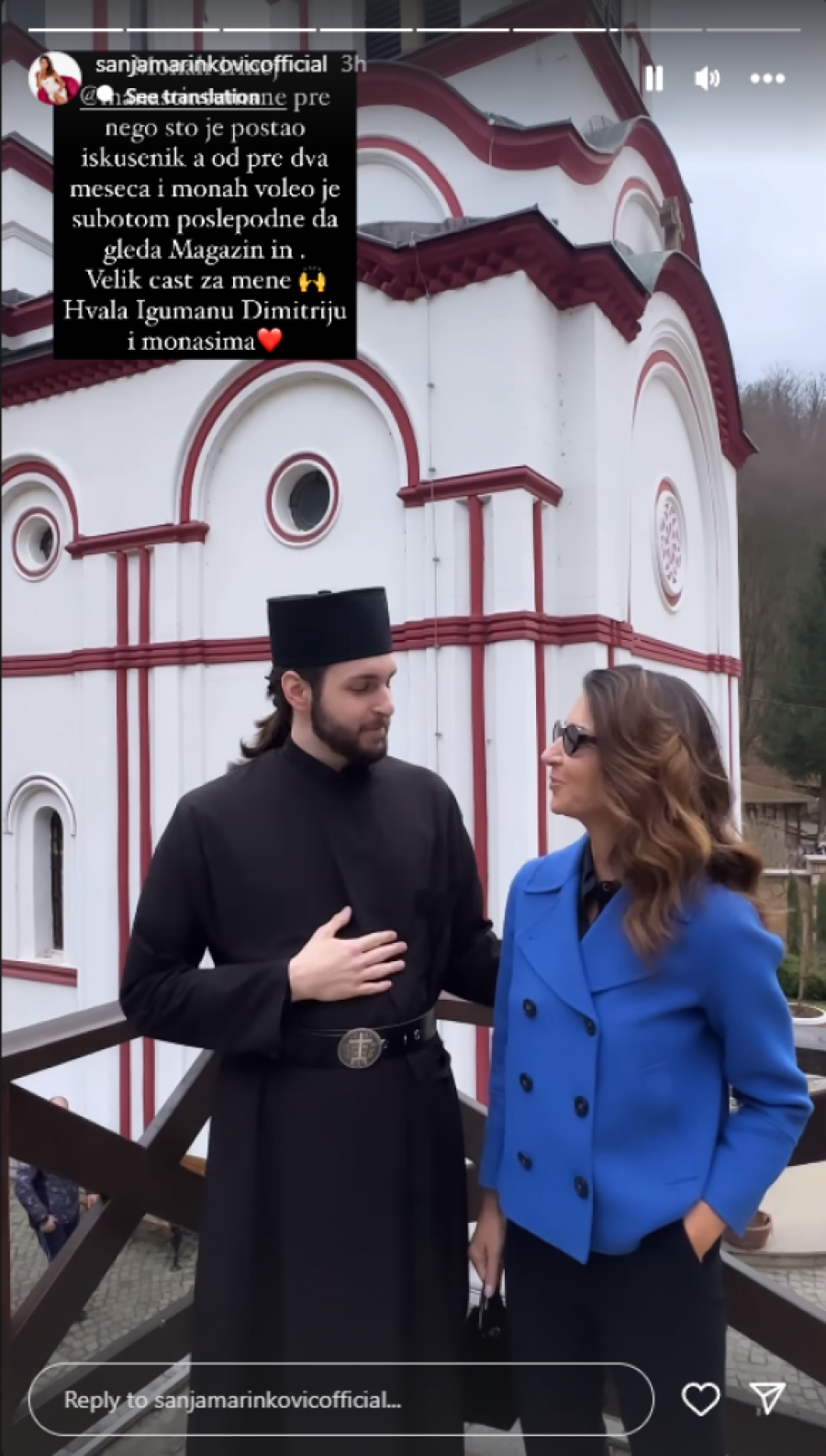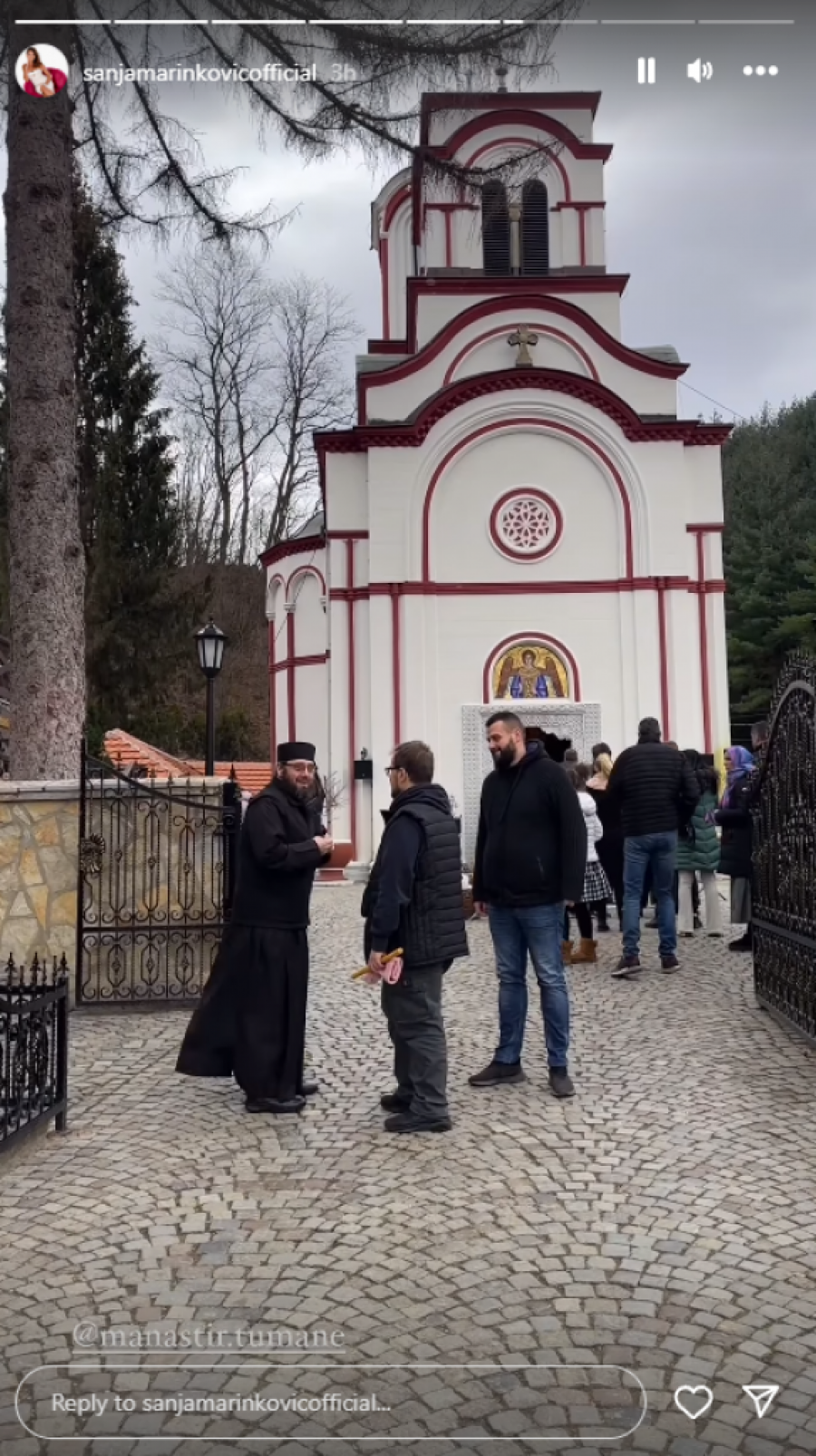 Voditeljka Sanja Marinković posetila je danas manastir Tumane. Ona je podelila snimak i nekoliko slika, na kojima je bio Iguman Dimitrije i monasi, a posebnu pažnju privuklo je njen razgovor sa monahom, koji joj je rekao da je voleo subotom popodne da gleda njenu emisiju, što je Sanja želela da podeli sa svojim pratiocima na društvenoj mreži Instagram.