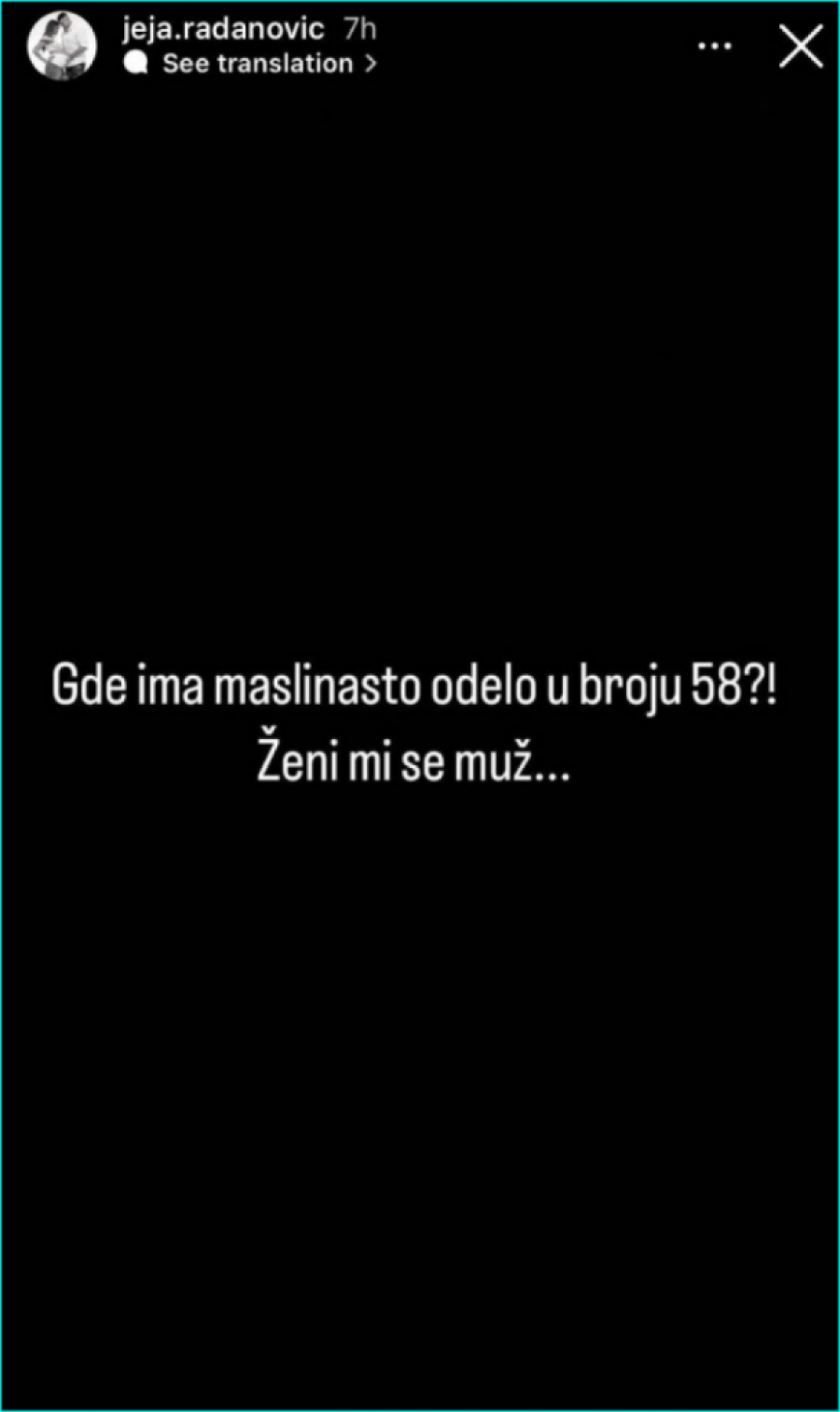 - Gde ima maslinasto odelo u broju 58? Ženi mi se muž - požalila se Jelena na Instagramu.