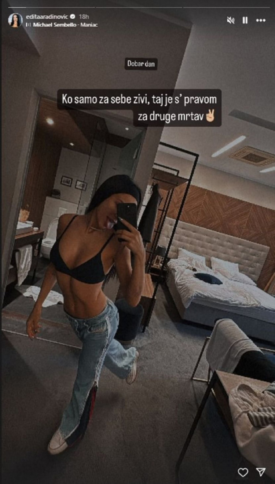 Aradinovićka je pozirala u crnom brushalteru i blago spuštenim teksas farmericama, pa su njeno poprsje i moćni trbušnjaci bili u prvom planu.