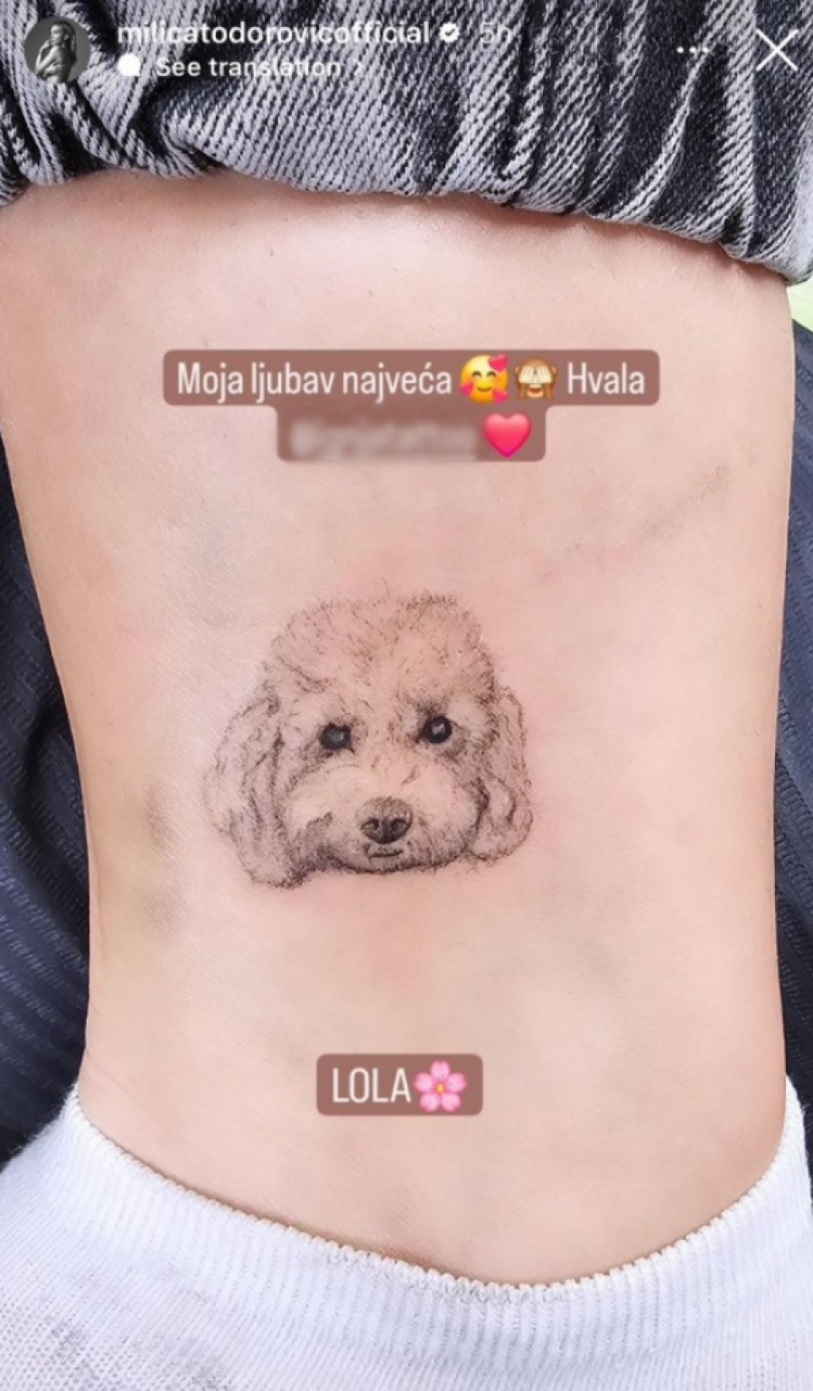 - "Moja najveća ljubav! Lola" - glasila je poruka koju je Milica napisala uz fotografiju svoje nove tetovaže, dok je Lazar kratko napisao "Đođo" uz sliku svoje tetovaže.