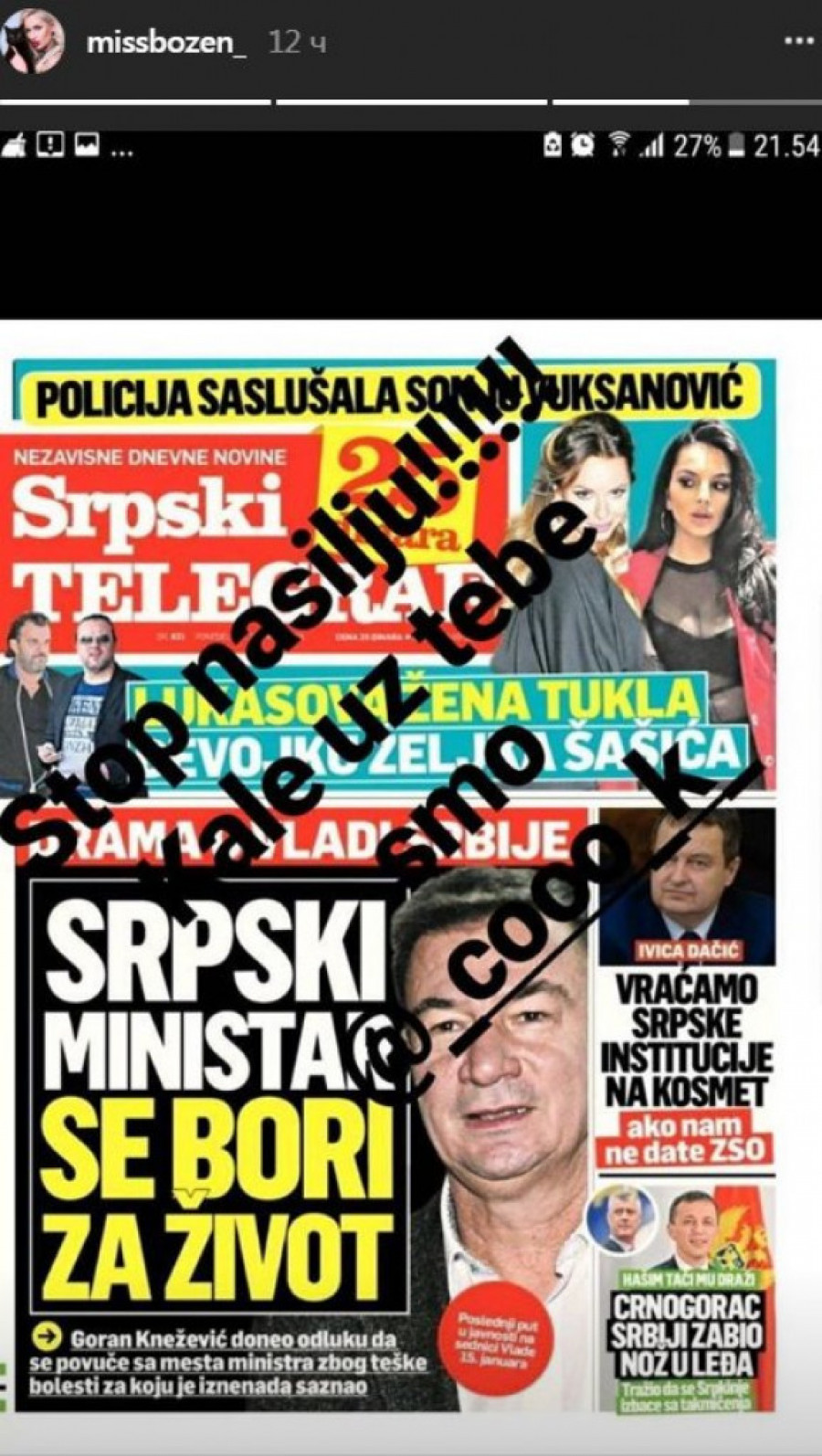 - Stop nasilju, Kale uz tebe smo - napisala je Božana na naslovnoj strani "Srpskog Telegrafa" koji je ovu priču ekskluzivno objavio.