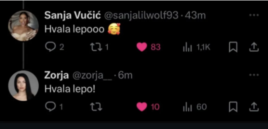 - Hvala lepo - napisala je najpre Sanja uz emotikon srca, a potom se nadovezala i Zorja sa istom porukom: