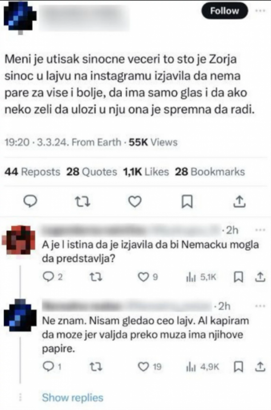- Meni je utisak finala "Pesme za Evroviziju" o što je Zorja u uživo uključenju na Instagramu izjavila da nema para za više i bolje. Rekla je kako ima samo glas i da ako neko želi da uloži u nju, spremnja je da radi - glasila je objava jedne korisnice platforme X (nekadašnji Tviter).