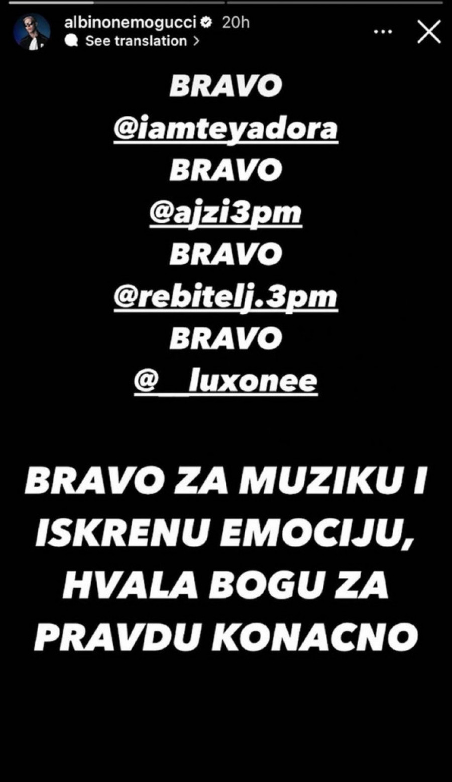 - Bravo, Teya Dora! Bravo za muziku i iskrenu emociju, hvala Bogu za pravdu konačno - napisao je, pa dodao: