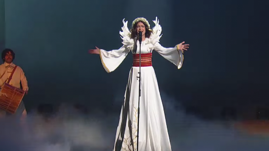 Njoj je iza na video bimu bio prikazan orao kako leti raširenim krilima, dok je na kostimu imala bela krila i venac na glavi.