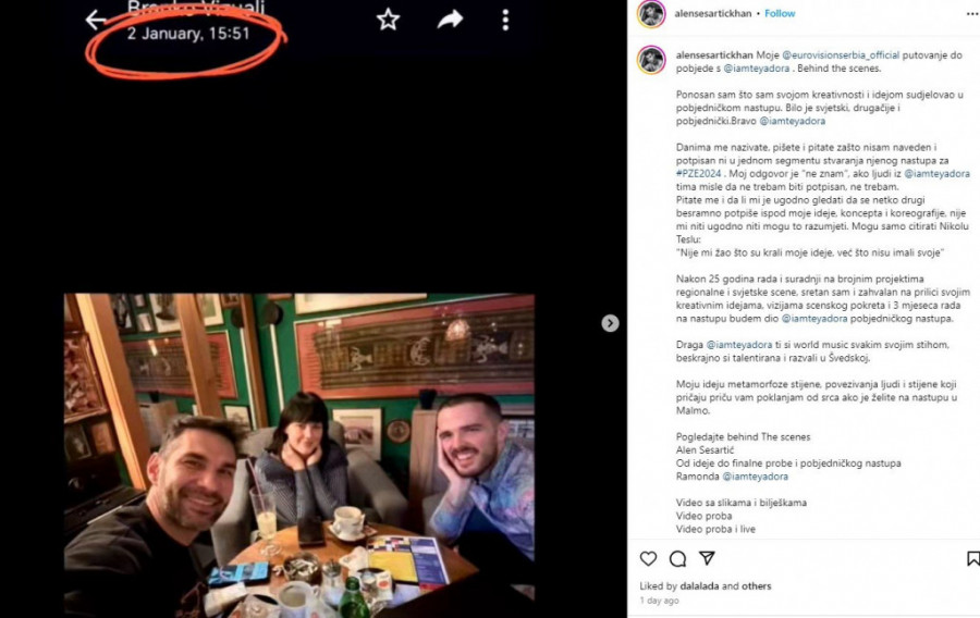 - Bez obzira na sve, ponosan sam na to što sam sa svojom kreativnošću i idejom doprineo pobedničkom nastupu. Ovo je svetski i nešto drugačije, ali ne bih pričao o svemu ovome namerno. Jednostavno, samo ne volim da se tako neko ophodi prema mom radu. Radio sam sa svetskim zvezdama, dugo radim ovaj posao i nikad nisam bio u situaciji da se ovako nešto desi. Nije čak u pitanju ni neka moja sujeta, ja sam osoba koja će lako da prizna da ima boljih, čak to i otvoreno kažem. Ali ova situacija je skroz nejasna.