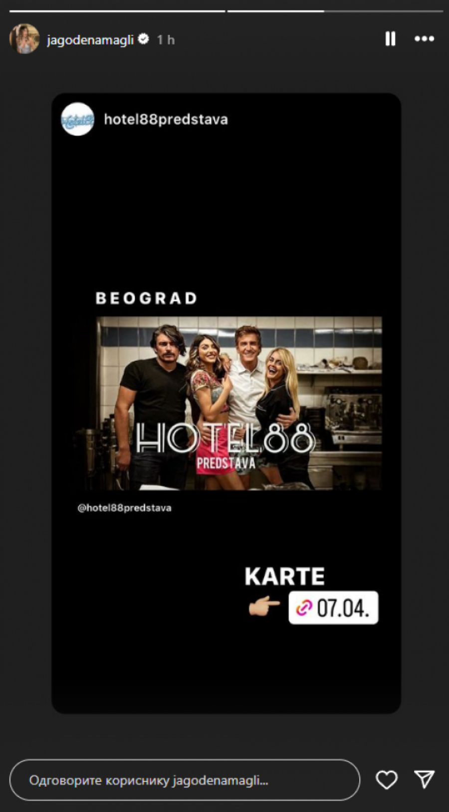 Naime, Jelisaveta je objavila plakate za najavu predstave "Hotel 88", u kojoj neće igrati, već igra glumica koja je njena zamena. Naime, Jelisavetu u predstavi menja Anđela Jovanović. Jelisaveta je objavila dva datuma za izvođenje predstave, ali se na najavnim plakatima ne nalazi ona, što izgleda znači da ona neće ni igrati, već njena zamena.