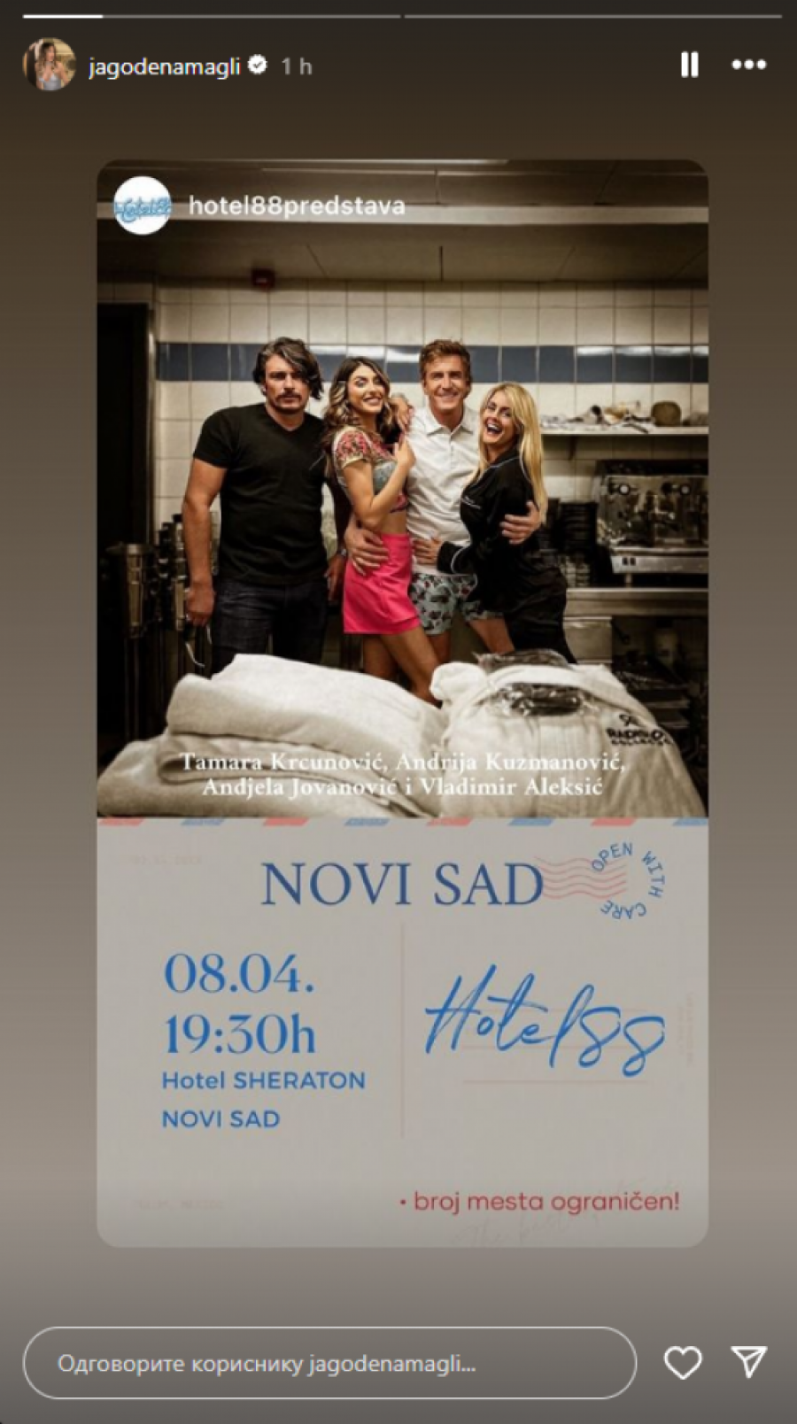 Popularna glumica Jelisaveta Orašanin danas se oglasila na društvenoj mreži Instagram. Dok domaća javnost čeka da ona otkrije da li se nešto dešava između košarkaša Miloša Teodosića i nje, Jelisaveta je odlučila da podrži kolege i predstavu u kojoj je nekad igrala.