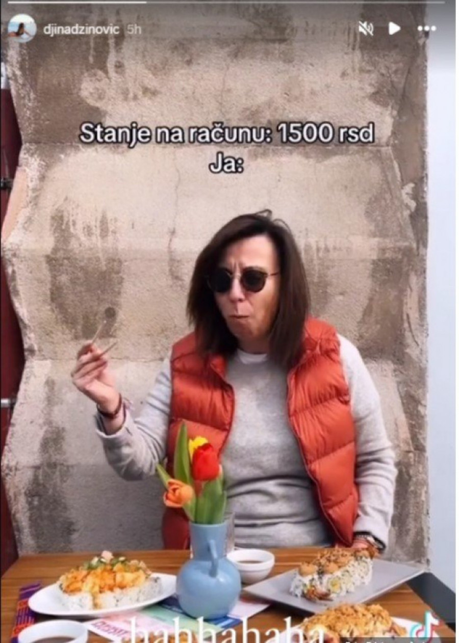Ćerka pevača Harisa Džinovića Đina Džinović nije se oglašavala do sada u jeku priče oko razvoda sa kreatorkom Melinom Džinović, ali je sada sve iznenadila objavom na društvenim mrežama. Naime, Đina se našalila na svoj račun, pa je okačila sliku sa natpisom da nema previše novca na svom računu, ali da uprkos tome troši novac po restoranima.