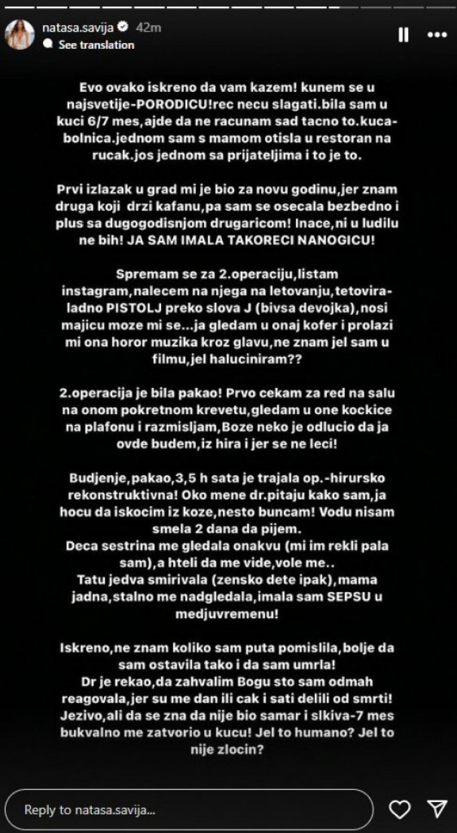 - Kunem se u porodicu, a to mi je najsvetije. Kad se sve ono desilo bila sam u kući i išla samo do bolnice. Šest meseci nigde nisam izlazila. Prvi izlazak mi je bio za doček Nove godine. Sećam se kako sam listala Instagram i videla da on (znaće svi na koga mislim) tetovira pištolj preko slova J, a to je bivša devojka. Na sebi je nosio majicu sa natpisom "može mi se". Gledam u kofer i prolazi mi ona horor muzika kroz glavu jer ne znam da li sam u filmu i da li haluciniram. Kad se setim povreda koje sam imala, znam da sam sebi pričala da bi bilo bolje da sam umrla. Doktor je rekao da treba da zahvalim Bogu što sam odmah reagovala, jer su me dani ili čak sati delili od smrti - napisala je između ostalog starleta u svojoj objavi na Instagramu.